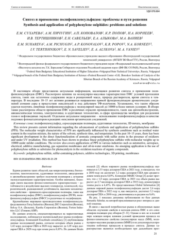 52. Cetina-Mancilla E., Reyes-Garcia G., Rodriguez-Molina M. Zolotukhin M.G., Vivaldo-Lima E., Gonzalez-Diaz M., Ramos-Ortiz G. Room temperature, simple and efficient synthesis and functionalization of aromatic poly(arylene sulfide)s, poly(arylene sulfoxide)s and poly(arylene sulfone)s // European Polym. J. 2022. V. 184. P. 111800. DOI: 10.1016/j.eurpolymj.2022.111800