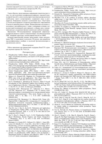 8. Ахмадуллин Р.М., Ирдинкин С.А., Шкодич В.Ф., Раков А.В., Фарахов М.М., Сайфуллин И.Н., Ахмадуллина А.Г., Антипин И.С. Разработка технологии получения полифениленсульфида // Журнал прикладной химии. 2022. Т. 95, Вып. 7. С. 885-893. DOI: 10.31857/S0044461822070076