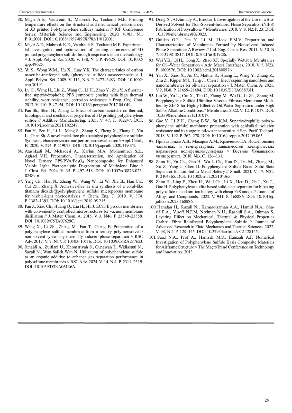 89. Wang X., Li Zh., Zhang M., Fan T., Cheng B. Preparation of a polyphenylene sulfide membrane from a ternary polymer/solvent/non-solvent system by thermally induced phase separation // RSC Adv. 2017. V. 7, N17. P. 10503-10516. DOI: 10.1039/C6RA28762J