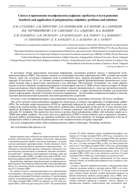 В настоящем обзоре представлена актуальная информация, касающаяся развития синтеза и применения полифениленсульфидов (ПФС). Рассмотрено влияние на молекулярно-массовые характеристики ПФС условий протекания синтеза, таких как остаточное содержание воды в реакционной массе, природа растворителя, время синтеза и температура. В последние 10–15 лет активно развивается направление прямой функционализации ароматических соединений атомами серы в присутствии окислителей и под действием УФ-излучения. Установлено, что таким образом удается получить линейные полифениленсульфиды с молекулярной массой до 10000 в более мягких условиях. В обзоре также рассмотрены области применения ПФС в различных отраслях промышленности, таких как автомобилестроение, авиакосмическая техника, электротехника; в аддитивных технологиях, в сфере производства мембран для разделения газов и нефтеводяных эмульсий. Отдельное актуальное направление – использование полифениленсульфида в качестве подложек фотокатализаторов в реакциях окисления органических соединений.