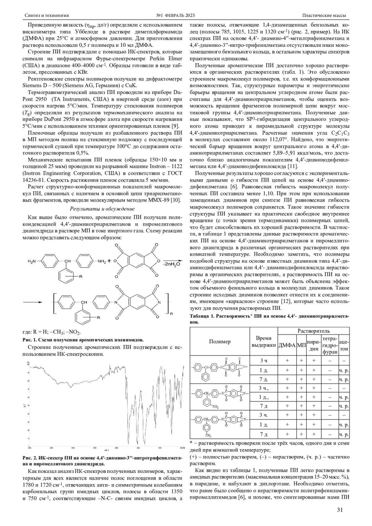 Ароматические полиимиды (ПИ) обладают рядом ценных физико-химических и эксплуатационных характеристик, что определяет их широкое применение в различных отраслях промышленности [1–3]. Однако данные полимеры трудно перерабатываются, что ограничивает объемы их применения [4]. В связи с этим внимание исследователей привлекают полиимиды, структуры макромолекул которых состоят не только из ароматических фрагментов, но и включают объемные боковые, шарнирные и другие группы. Такое сочетание различных жестких, объемных, шарнирных фрагментов в цепи макромолекулы ПИ позволит придать полимеру одновременно высокие физико-механические показатели и необходимую технологичность, т. е. растворимость в органических растворителях и плавкость [4]. В этом плане достаточно интересными соединениями являются 4,4′-диаминотриарилметаны, которые были эффективно использованы в конденсационных процессах при получении различных полимеров, в частности, полиамидов [5].