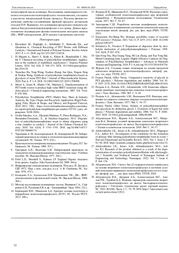 1. 	Khoonkari M., Haghighi A., Sefi dbakht Y., Shekoohi Kh., and Ghaderian A.. Chemical Recycling of PET Wastes with Different Catalysts // International Journal of Polymer Science. Review Article 2015. Р. 1-11. DOI: 10.1155/2015/124524
