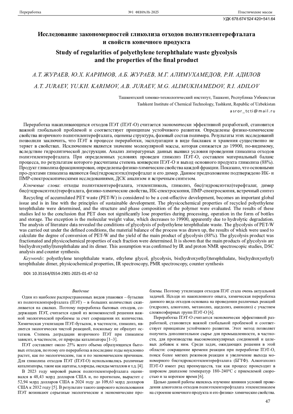 27. 	Abduvokhidov I.K., Juraev A.B., Alimukhamedov M.G., Adilov R.I. Research of the product obtained as a result of the depolymerization of secondary polyethyleneterefthalate with ethyleneglycol // Scientifi c and Technical Journal of Namangan Instituti of Engineering and Technology. Namangan. 2022. Vol. 7. Issue 4. Р. 164-176.