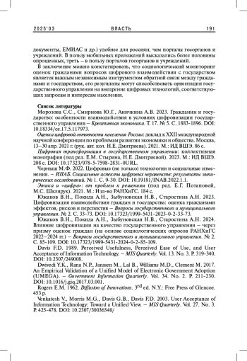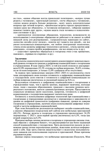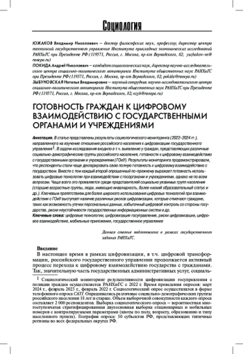 7. 	Южаков В.Н., Покида А.Н., Зыбуновская Н.В., Старостина А.Н. 2024. Влияние цифровизации на качество государственного управления - через призму оценок граждан (на основе социологических опросов РАНХиГС 2022-2024 гг.) - Вопросы государственного и муниципального управления. № 2. C. 85-109. DOI: 10.17323/1999-5431-2024-0-2-85-109 EDN: DPFSNQ