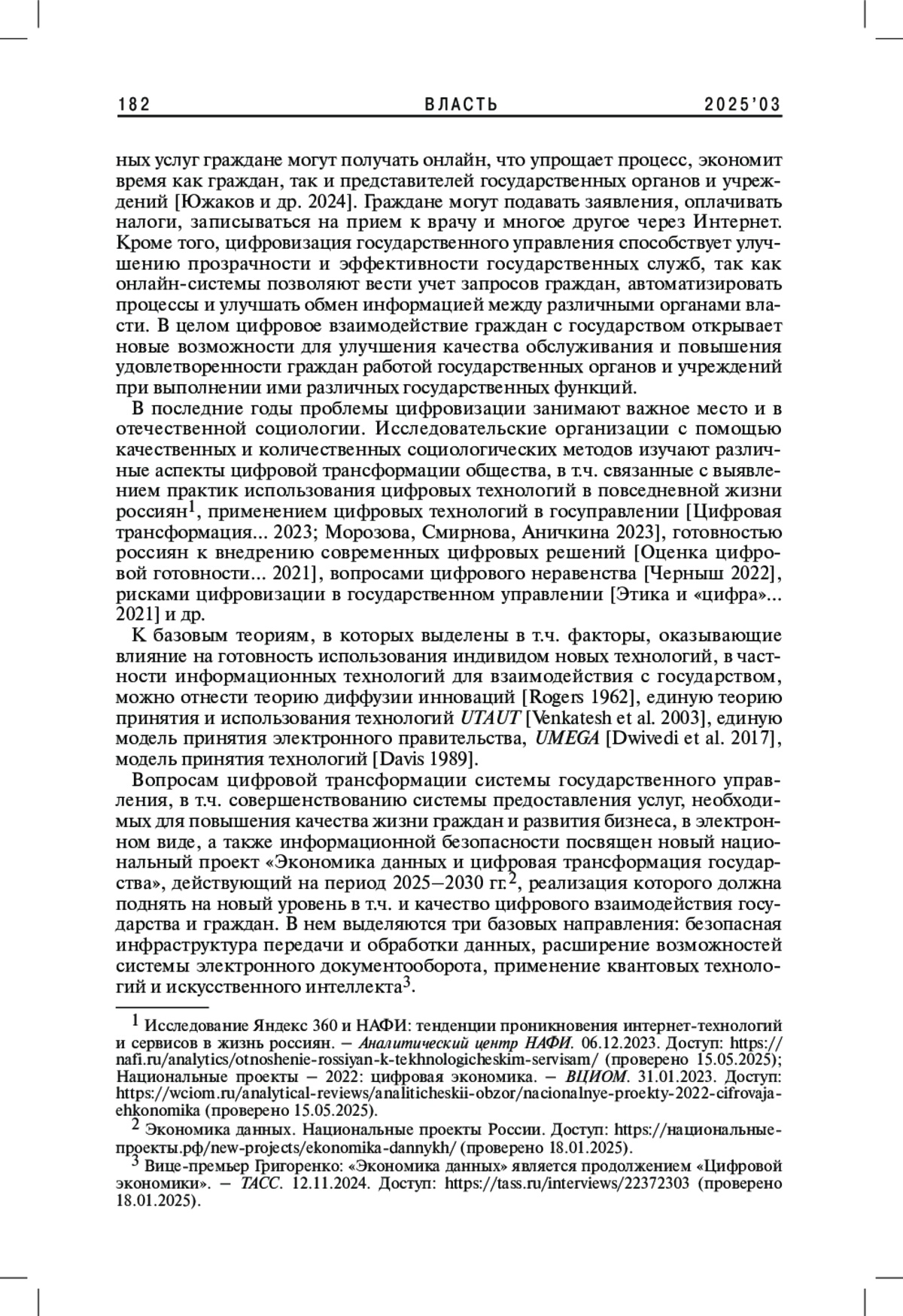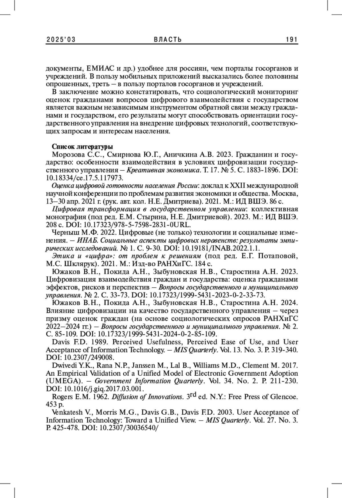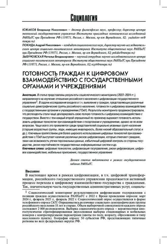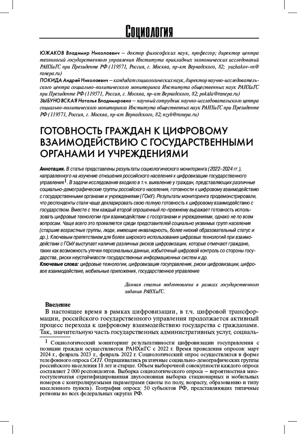 6. 	Южаков В.Н., Покида А.Н., Зыбуновская Н.В., Старостина А.Н. 2023. Цифровизация взаимодействия граждан и государства: оценка гражданами эффектов, рисков и перспектив. - Вопросы государственного и муниципального управления. № 2. C. 33-73. DOI: 10.17323/1999-5431-2023-0-2-33-73 EDN: BRJMAM
