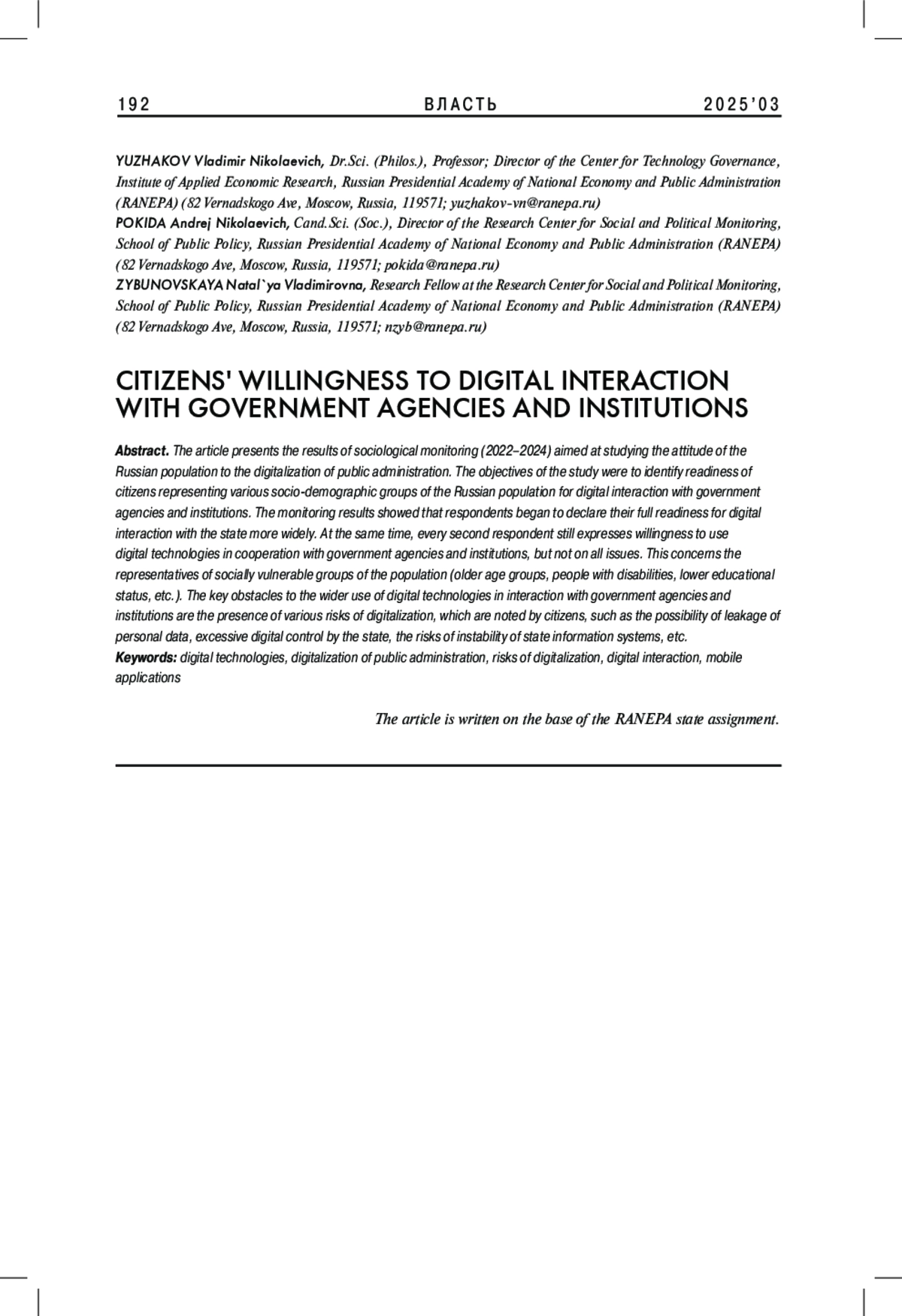 В статье представлены результаты социологического мониторинга (2022-2024 гг.), направленного на изучение отношения российского населения к цифровизации государственного управления. В задачи исследования входило в т. ч. выявление у граждан, представляющих различные социально-демографические группы российского населения, готовности к цифровому взаимодействию с государственными органами и учреждениями (ГОиУ). Результаты мониторинга продемонстрировали, что респонденты стали чаще декларировать свою полную готовность к цифровому взаимодействию с государством. Вместе с тем каждый второй опрошенный по-прежнему выражает готовность использовать цифровые технологии при взаимодействии с госорганами и учреждениями, однако не по всем вопросам. Чаще всего это проявляется среди представителей социально уязвимых групп населения (старшие возрастные группы, люди, имеющие инвалидность, более низкий образовательный статус и др.). Ключевым препятствием для более широкого использования цифровых технологий при взаимодействии с ГОиУ выступает наличие различных рисков цифровизации, которые отмечают граждане, таких как возможность утечки персональных данных, избыточный цифровой контроль со стороны государства, риски неустойчивости государственных информационных систем и др.