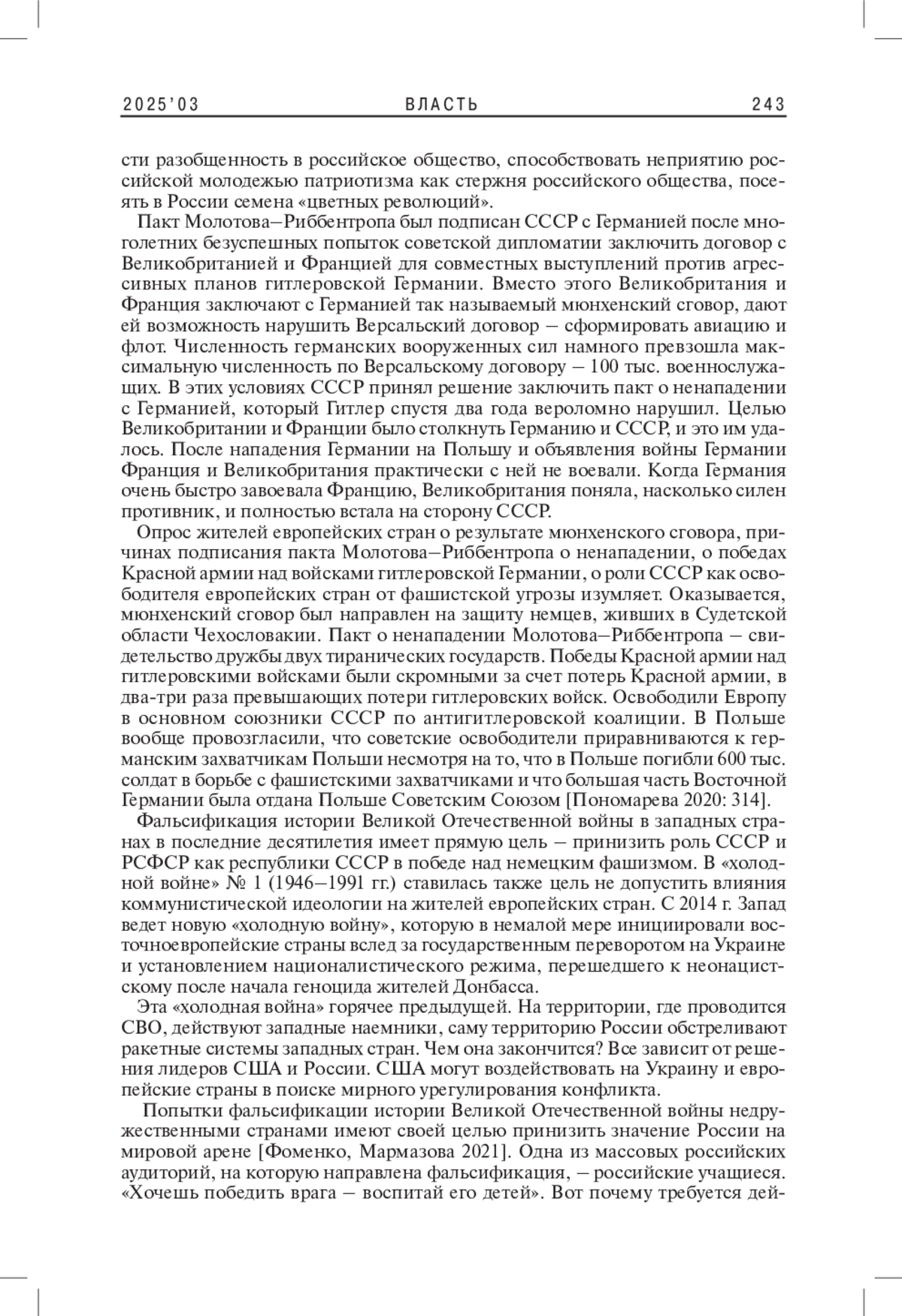 5. 	Фоменко М.В., Мармазова Т.И. 2021. Попытки фальсификации истории в борьбе против России: переоценка итогов Второй мировой войны. - Современная научная мысль. № 2. С. 95-100. EDN: LGDIII