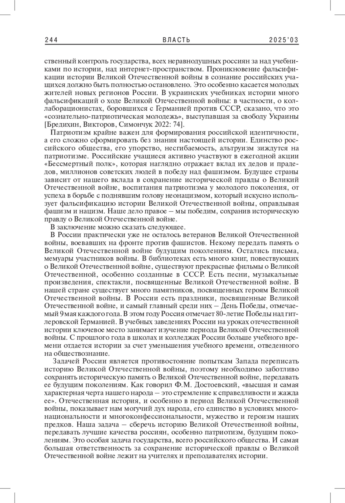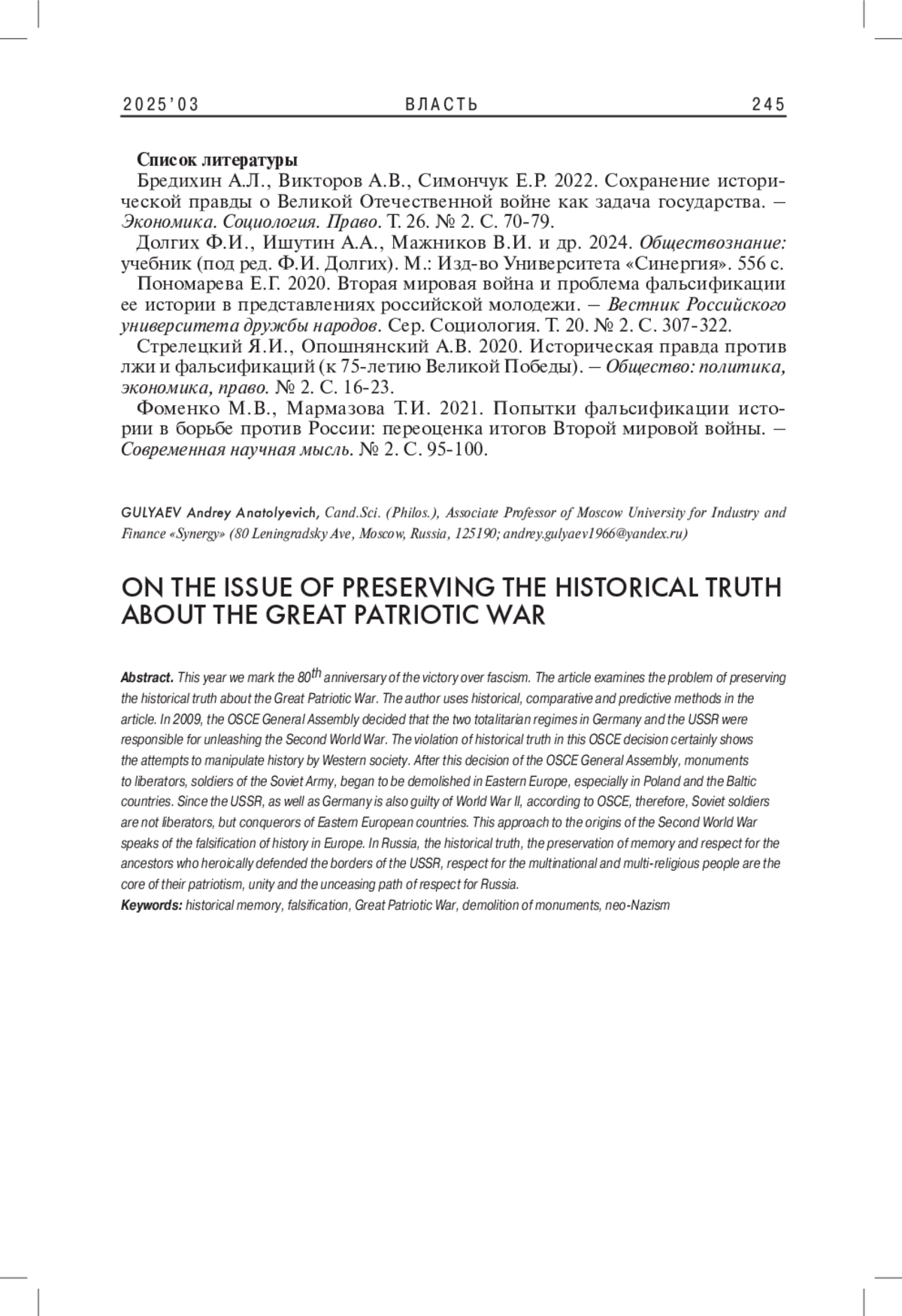 1. 	Бредихин А.Л., Викторов А.В., Симончук Е.Р. 2022. Сохранение исторической правды о Великой Отечественной войне как задача государства. - Экономика. Социология. Право. Т. 26. № 2. С. 70-79.