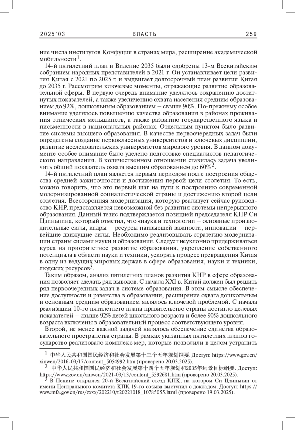 В рамках данного исследования предпринята попытка проанализировать особенности реализации государственной политики КНР в деле развития системы образования. Сфера образования занимает особое место в программе модернизации Китая, и эффективность ее функционирования рассматривается как одно из базовых условий обеспечения социально-экономического благополучия. Законы об образовании, принятые в конце 1990-х гг., определили основные рамки, в которых реализуется образовательная политика. На их основе разработан ряд специальных программ развития направлений и уровней образования. Пятилетние планы выступают как основной программный документ, который определяет целевые показатели социально-экономического развития. В рамках данной статьи изучены пятилетние планы с 2001 по 2025 г. в части развития системы образования. Выявлено, что основными задачами в указанный период были обеспечение доступности среднего образования, выравнивание региональных диспропорций в развитии образования, создание условий для образования в течение всей жизни. В программах 13-го и 14-го пятилетних планов отдельное внимание уделено расширению образовательного влияния на международном уровне; высшее образование рассматривается как особое направление внешней политики современного Китая.