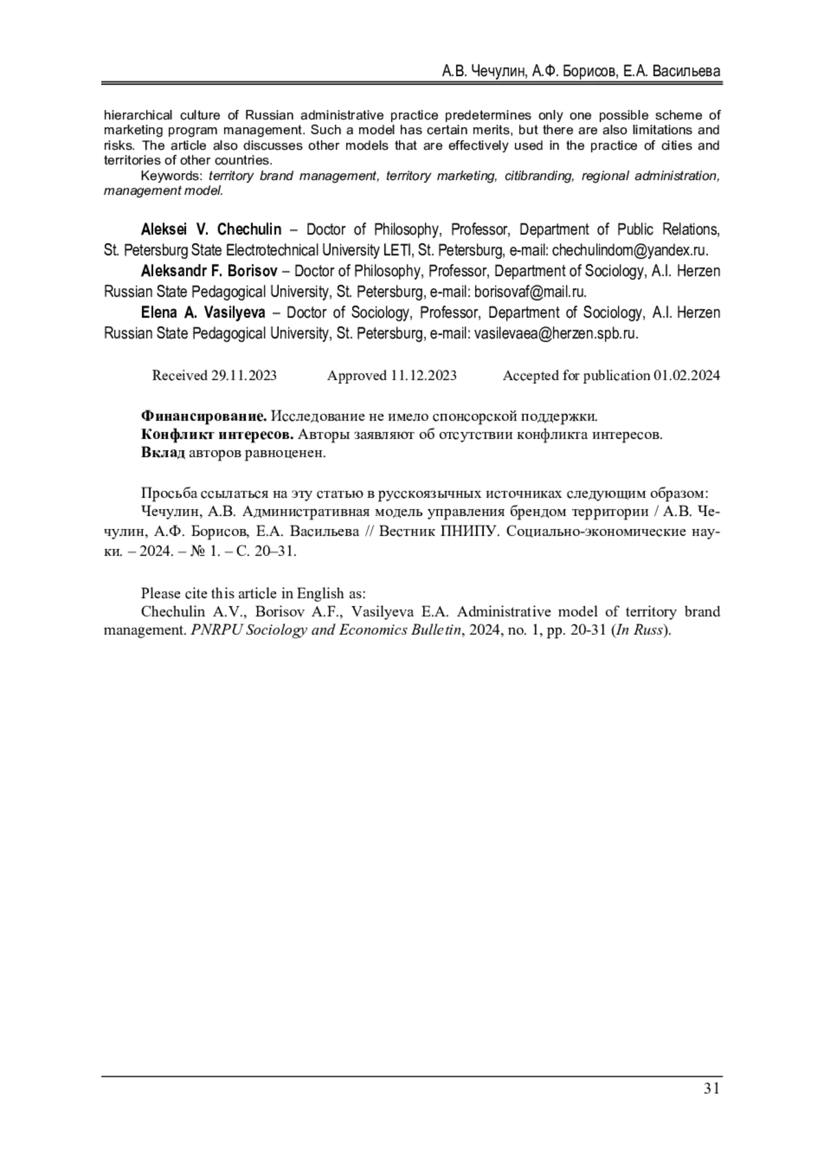 22. Дубейковский В.А. Вовлечение жителей в разработку бренда города: классификация механизмов и методы оценки // Вопросы государственного и муниципального управления. - 2014. - № 4. - С. 153-178. EDN: TFLMKH