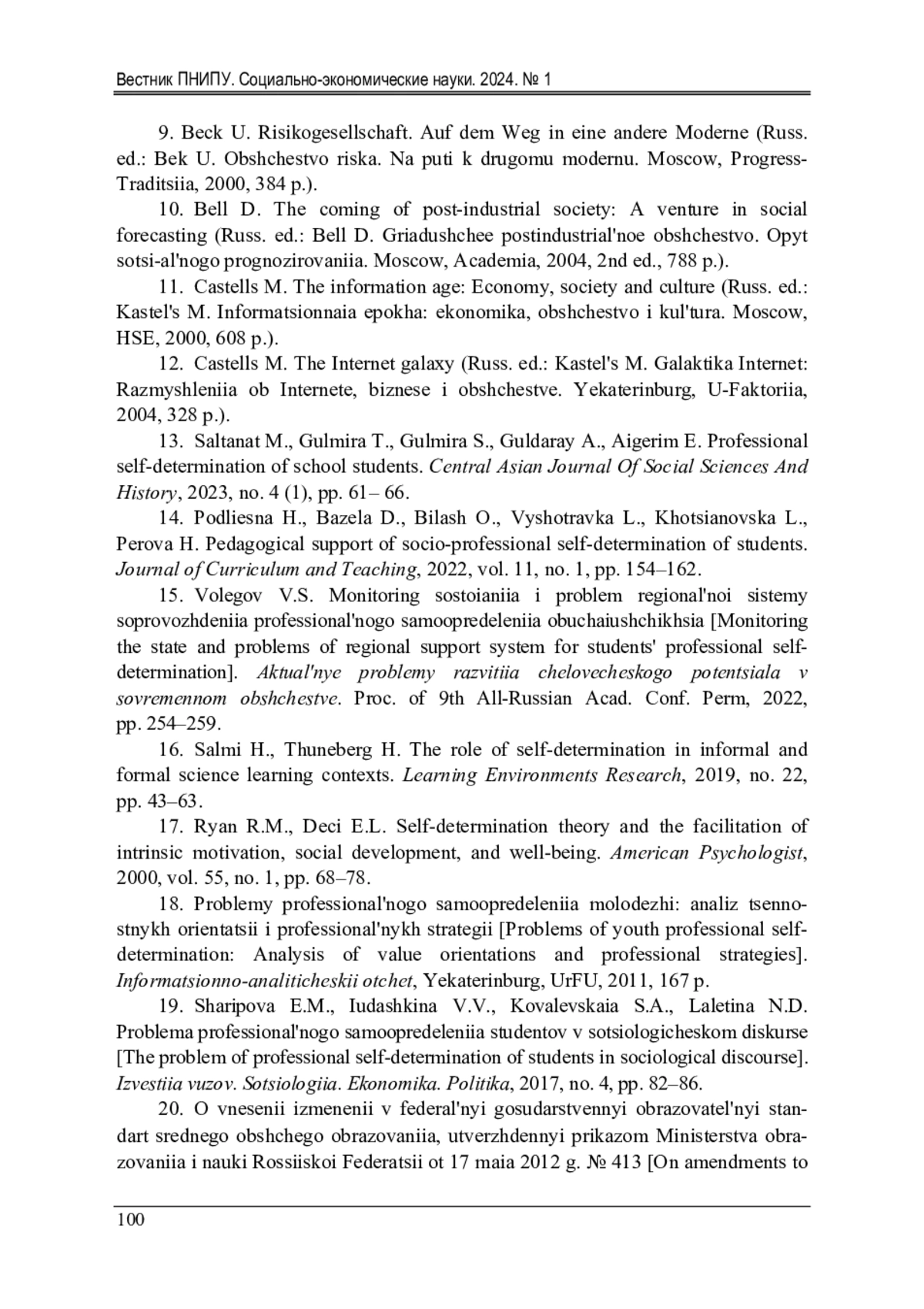 19. 	Проблема профессионального самоопределения студентов в социологическом дискурсе / Э.М. Шарипова, В.В. Юдашкина, С.А. Ковалевская, Н.Д. Лалетина // Известия вузов. Социология. Экономика. Политика. - 2017. - № 4. - С. 82-86.  EDN: YMCGIP