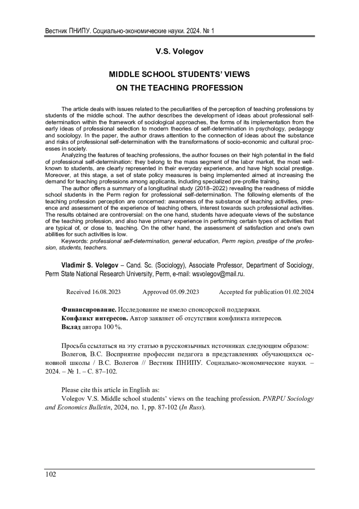 15. 	Волегов В.С. Мониторинг состояния и проблем региональной системы сопровождения профессионального самоопределения обучающихся // Актуальные проблемы развития человеческого потенциала в современном обществе: материалы IX Всерос. (с междунар. участием) науч.-практ. конф. - Пермь, 2022. - С. 254-259.  EDN: QSUHOR
