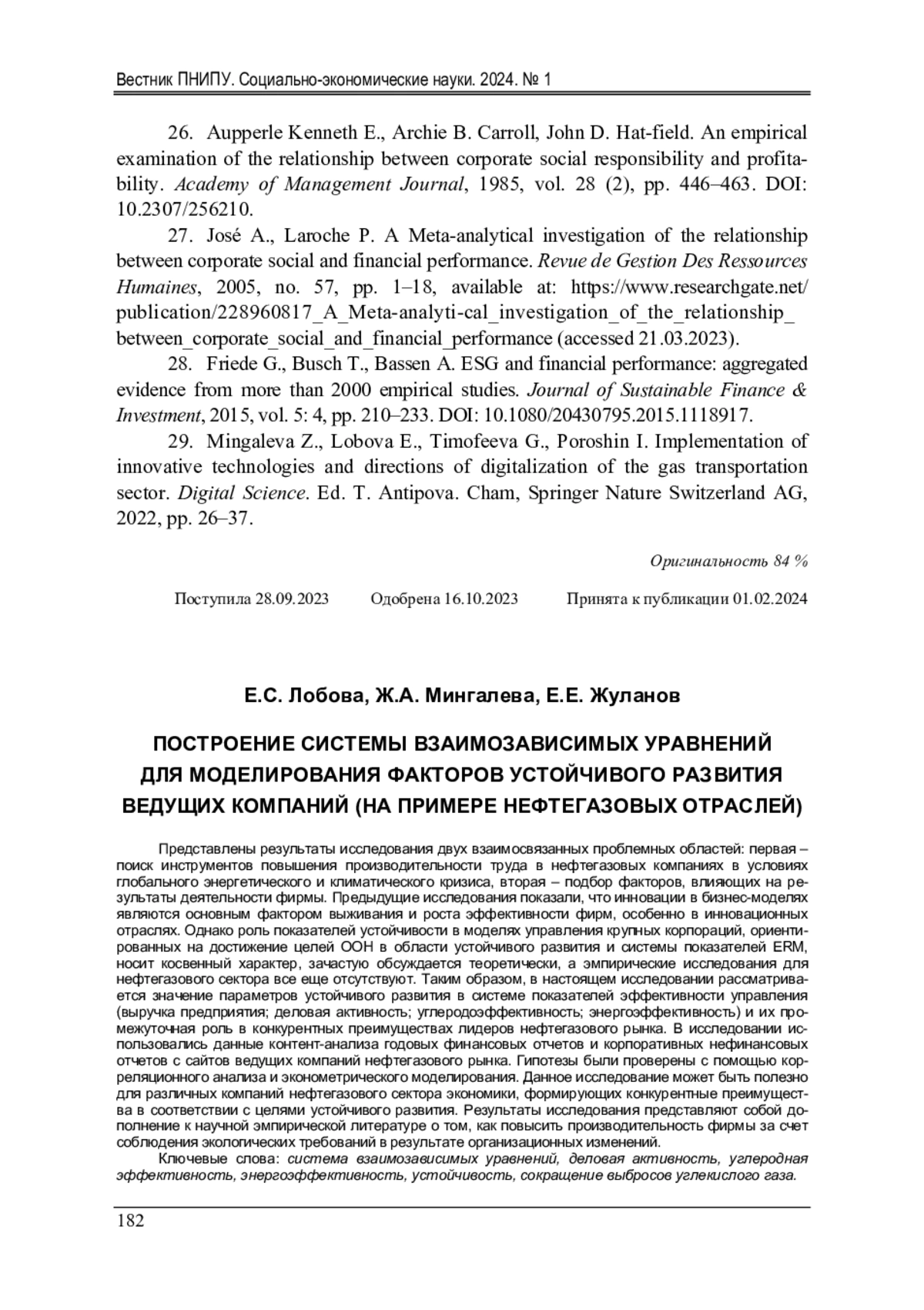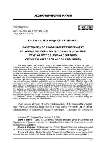 Представлены результаты исследования двух взаимосвязанных проблемных областей: первая - поиск инструментов повышения производительности труда в нефтегазовых компаниях в условиях глобального энергетического и климатического кризиса, вторая - подбор факторов, влияющих на результаты деятельности фирмы. Предыдущие исследования показали, что инновации в бизнес-моделях являются основным фактором выживания и роста эффективности фирм, особенно в инновационных отраслях. Однако роль показателей устойчивости в моделях управления крупных корпораций, ориентированных на достижение целей ООН в области устойчивого развития и системы показателей ERM, носит косвенный характер, зачастую обсуждается теоретически, а эмпирические исследования для нефтегазового сектора все еще отсутствуют. Таким образом, в настоящем исследовании рассматривается значение параметров устойчивого развития в системе показателей эффективности управления (выручка предприятия; деловая активность; углеродоэффективность; энергоэффективность) и их промежуточная роль в конкурентных преимуществах лидеров нефтегазового рынка. В исследовании использовались данные контент-анализа годовых финансовых отчетов и корпоративных нефинансовых отчетов с сайтов ведущих компаний нефтегазового рынка. Гипотезы были проверены с помощью корреляционного анализа и эконометрического моделирования. Данное исследование может быть полезно для различных компаний нефтегазового сектора экономики, формирующих конкурентные преимущества в соответствии с целями устойчивого развития. Результаты исследования представляют собой дополнение к научной эмпирической литературе о том, как повысить производительность фирмы за счет соблюдения экологических требований в результате организационных изменений.
