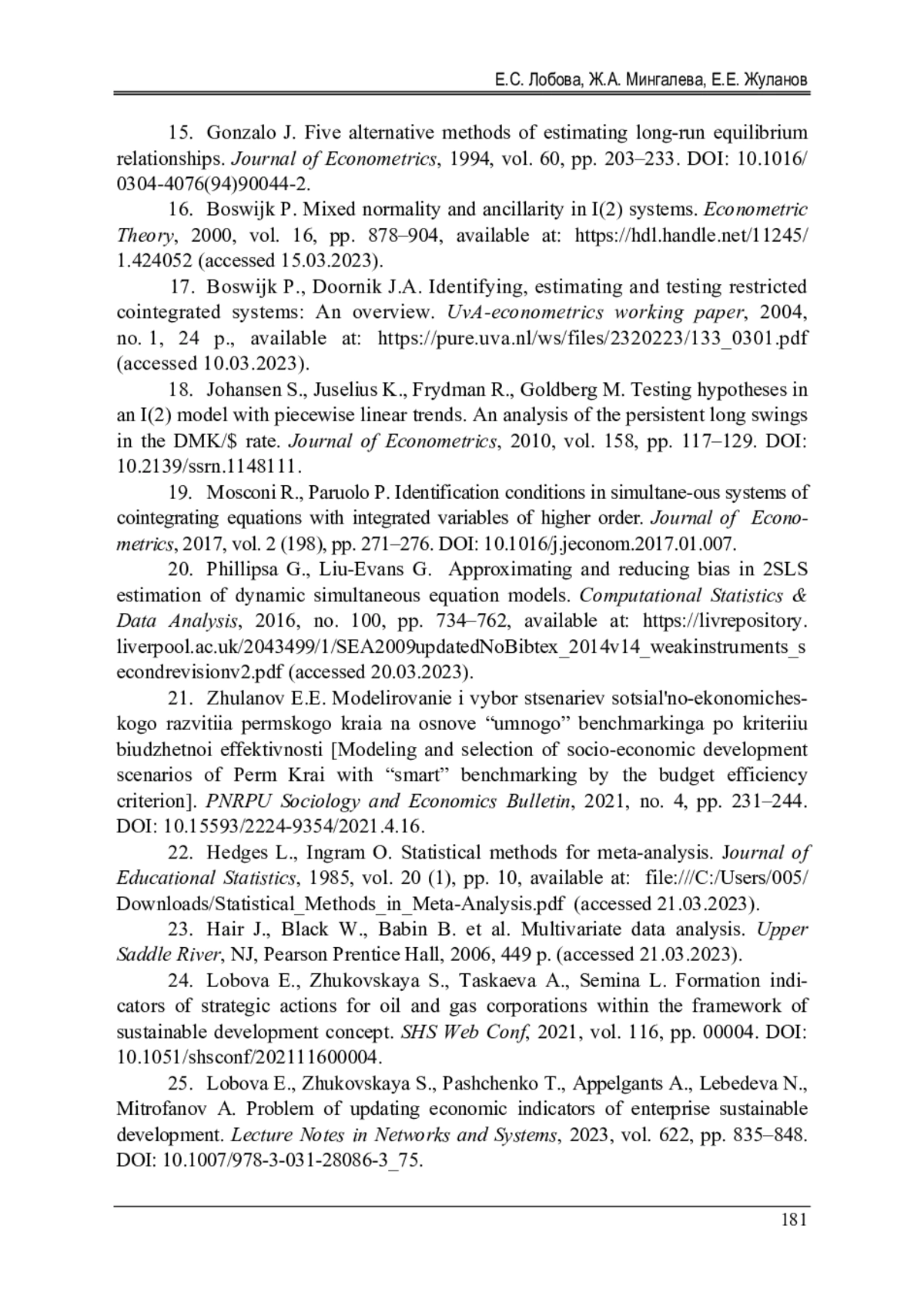 17. 	Boswijk P., Doornik J.A. Identifying, estimating and testing restricted cointegrated systems: An overview // UvA-econometrics working paper. - 2004. - No. 1. - 24 p. - URL: https://pure.uva.nl/ws/files/2320223/133_0301.pdf (accessed 10 March 2023).