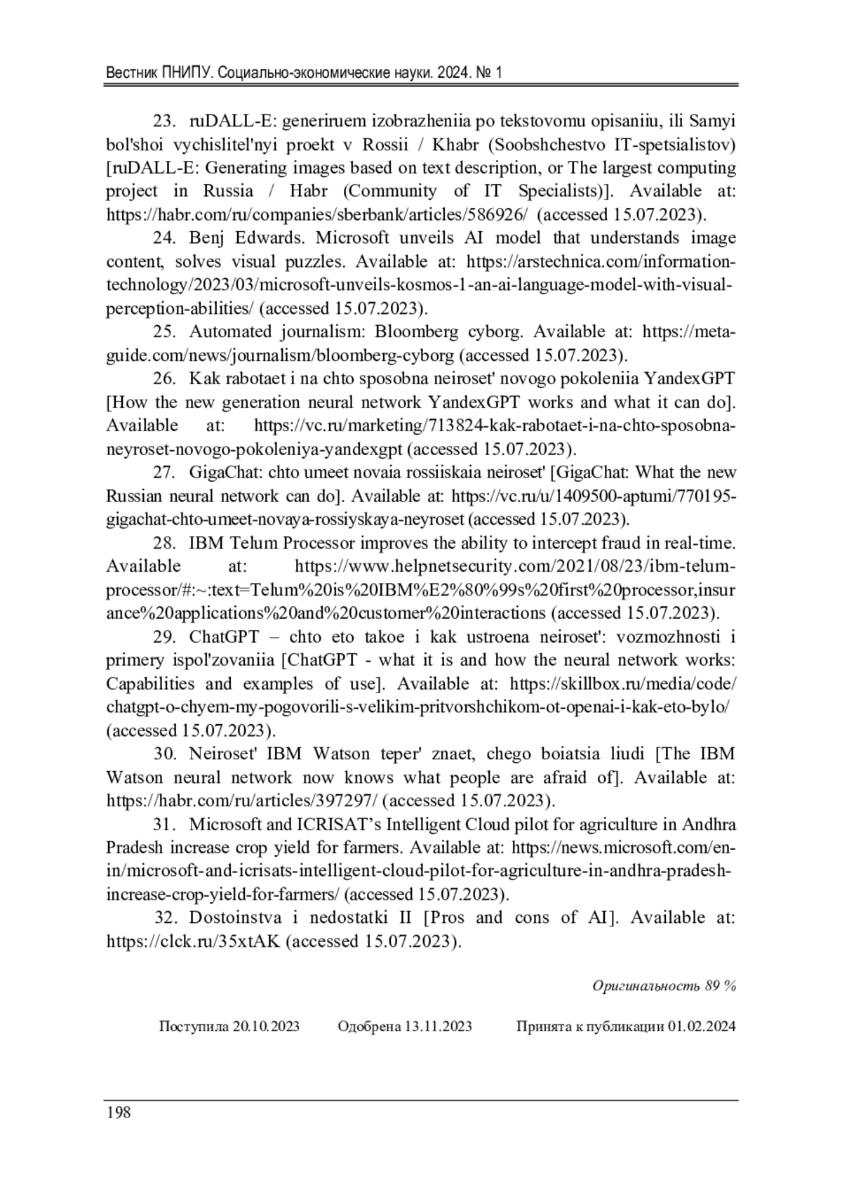 32. 	Достоинства и недостатки ИИ [Электронный ресурс]. - URL: https://clck.ru/35xtAK (дата обращения: 15.07.2023).