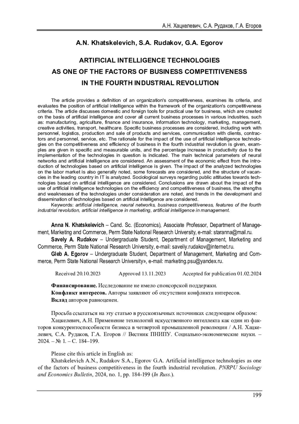 Представлено определение конкурентоспособности организации, рассмотрены ее критерии, оценены позиции искусственного интеллекта в рамках критериев конкурентоспособности организации. Рассмотрены отечественные и зарубежные инструменты практического применения для бизнеса, которые созданы на базе искусственного интеллекта и охватывают все актуальные бизнес-процессы в разнообразных отраслях, таких как производство, сельское хозяйство, финансы и страхование, информационные технологии, маркетинг, менеджмент, творческие виды деятельности, транспорт, здравоохранение. Рассмотрены конкретные бизнес-процессы, включающие в себя работу с персоналом, логистику, производство и реализацию продукции и услуг, коммуникацию с клиентами, контрагентами и персоналом, сервис и т. п. Приведено обоснование влияния применения технологий искусственного интеллекта на конкурентоспособность и эффективность бизнеса в четвертой промышленной революции. Примеры приведены в конкретных и измеримых единицах; указан процентный прирост производительности за счет внедрения рассматриваемых технологий. Рассмотрены основные технические параметры нейронных сетей и искусственного интеллекта. Дана оценка экономического эффекта от внедрения технологий на базе искусственного интеллекта. Также в общих чертах отмечено влияние анализируемых технологий на рынок труда, рассмотрены некоторые прогнозы, проанализирована структура вакансий в стране-лидере по IT. Рассмотрены социологические опросы относительно общественного отношения к технологиям на базе искусственного интеллекта. Сделаны выводы о влиянии применения технологий искусственного интеллекта на эффективность и конкурентоспособность бизнеса, отмечены сильные и слабые стороны рассматриваемых технологий, рассмотрены тенденции развития и распространения технологий на базе искусственного интеллекта.