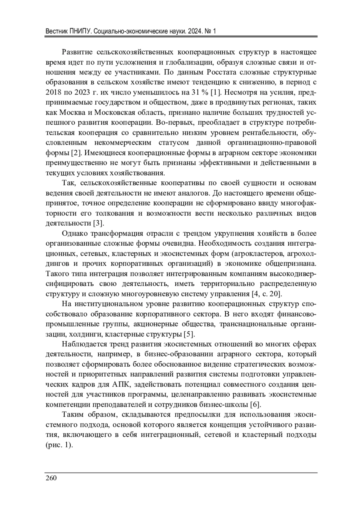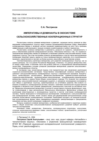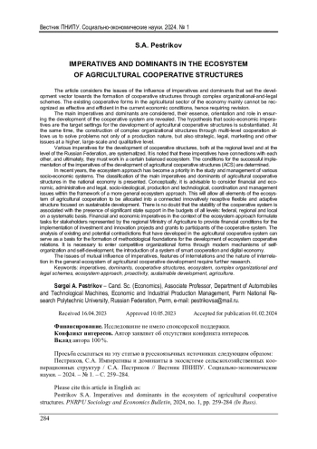 3. 	Пестриков С.А. Природа возникновения кооперативных образований в аграрном секторе и их роль в социально-экономическом развитии экономики // Вестник Пермского национального исследовательского политехнического университета. Социально-экономические науки. - 2022. - № 3. - С. 259-278.  EDN: SCPTPK