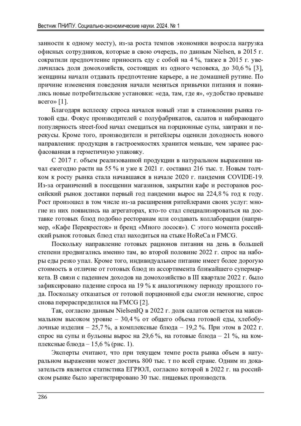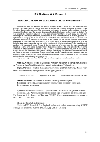 Готовая еда - это динамичная, быстрорастущая категория, представленная в направлении FMСG. С 2017 г. конъюнктура рынка в России меняется, наблюдается ежегодный прирост категории в натуральном выражении и рублях. В статье рассмотрены особенности рынка готовой еды в условиях неопределенности на примере Пермского края. Изучена общая динамика статистических показателей по рынку. Тренд на максимальное сокращение временных издержек при приготовлении пищи в пользу работы, учебы и отдыха, который начал формироваться в это время, стал дополнительным драйвером спроса. Кроме того, пищевое поведение людей меняется в связи с переходом общества из постиндустриального в цифровое. Потребитель все чаще стал обращать внимание на качество продукта и предоставляемый ему сервис. Изменившиеся предпочтения потребителей формируют спрос на гибридный формат магазинов на стыке ритейла и HoReCa. Сейчас каждый прогрессивный продуктовый ритейлер имеет в своей ассортиментной матрице собственную готовую продукцию и SKU от сторонних поставщиков. Благодаря развитию e-commerce покупка готовых блюд стала еще проще и удобнее. В статье также рассмотрено развитие рынка готовой еды в сложных условиях, которые создали пандемия COVID-19 и санкции, при активной стадии импортозамещения и укреплении суверенитета страны, на примере Пермского края. Изучены драйверы роста рынка готовой еды, сформированные под влиянием санкций и блокировки социальных сетей. Обоснован рост и развитие ниши готовой еды в Пермском крае, несмотря на существующую неопределенность рынка.