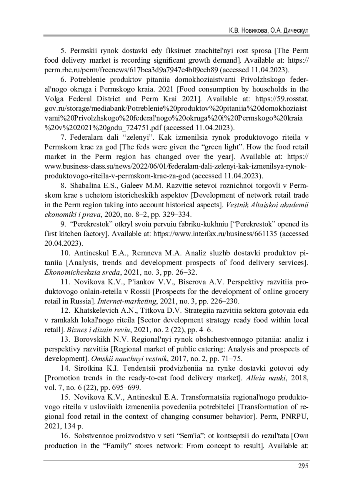 15. 	Новикова К.В., Антинескул Е.А. Трансформация регионального продуктового ритейла в условиях изменения поведения потребителей / Перм. гос. нац. исслед. ун-т. - Пермь, 2021. - 134 с.