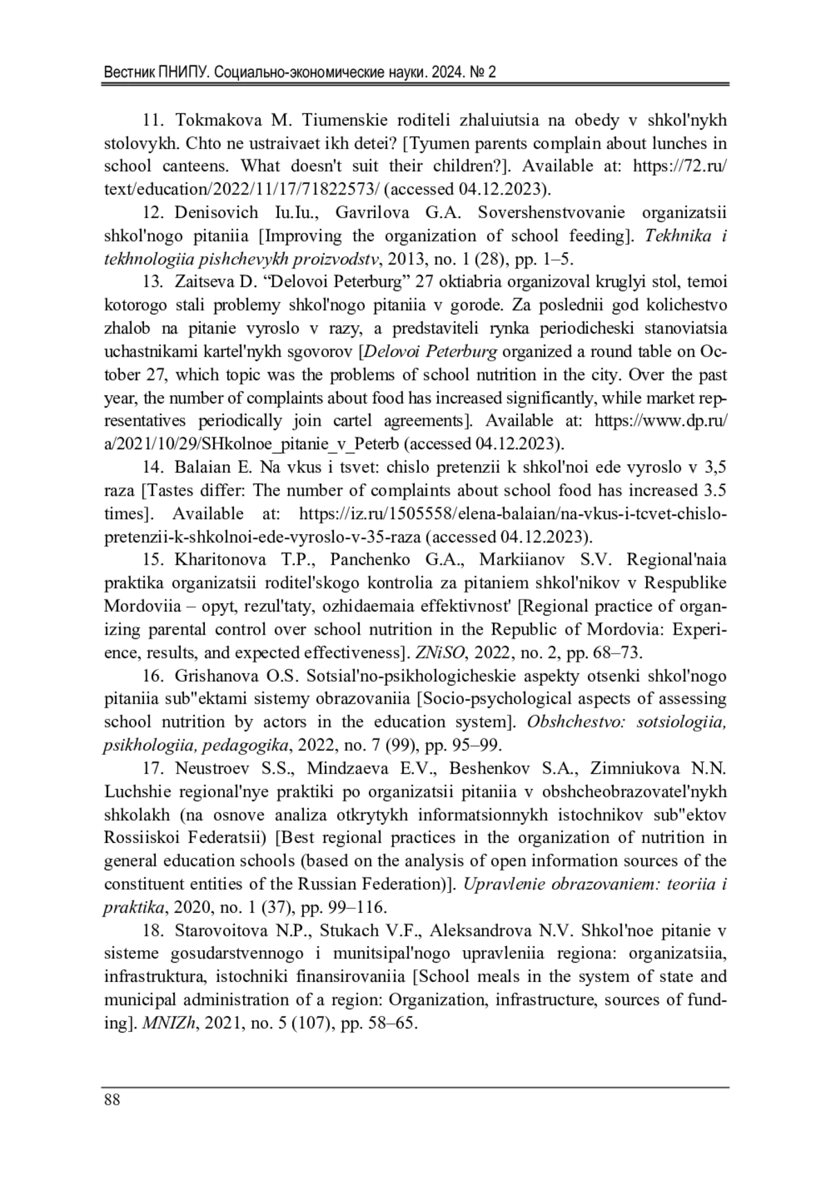 15. 	Харитонова, Т.П. Региональная практика организации родительского контроля за питанием школьников в Республике Мордовия - опыт, результаты, ожидаемая эффективность / Т.П. Харитонова, Г.А. Панченко, С.В. Маркиянов // ЗНиСО. - 2022. - № 2. - C. 68-73.  EDN: FULPFU