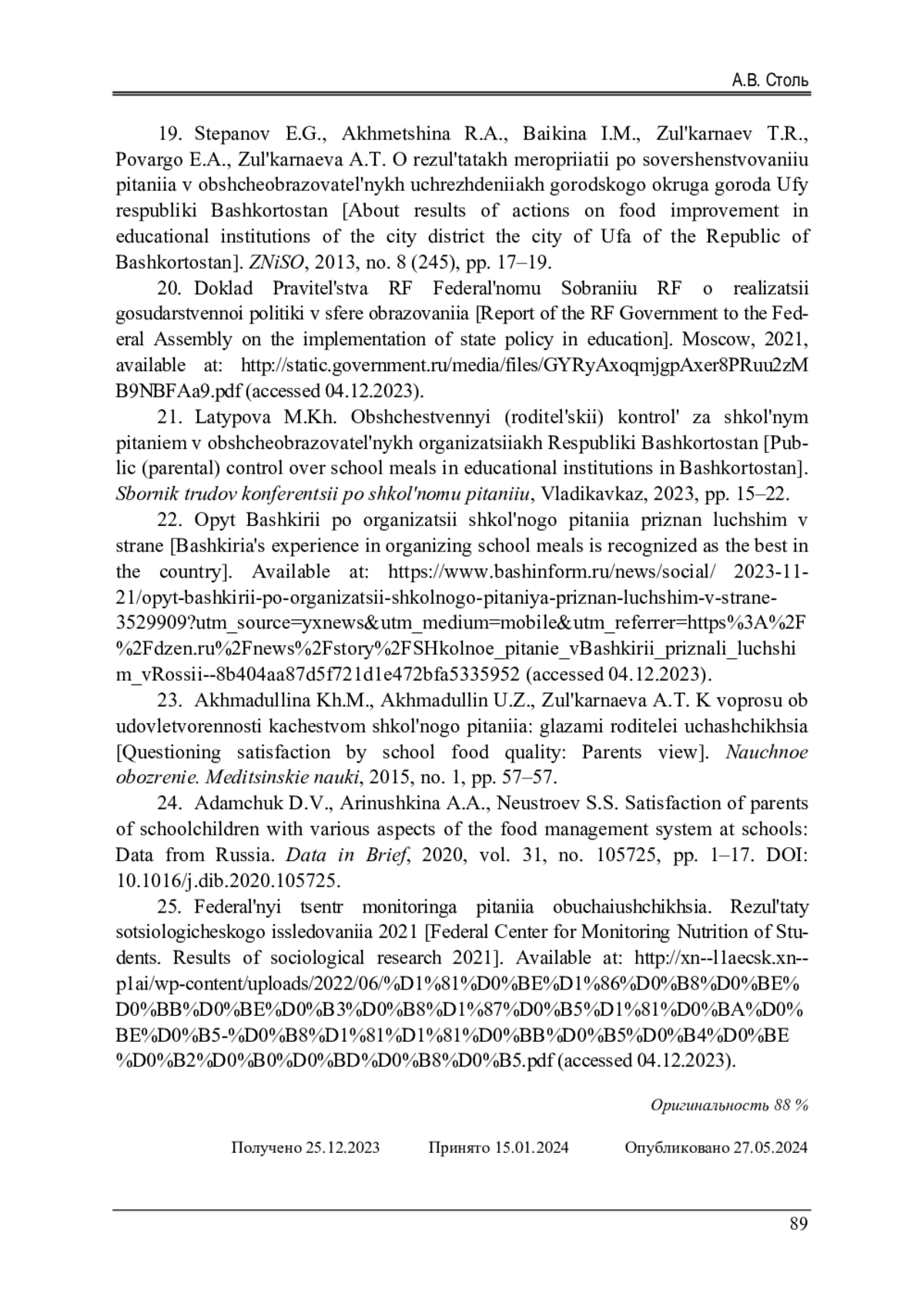 24. 	Adamchuk, D.V. Satisfaction of parents of schoolchildren with various aspects of the food management system at schools: Data from Russia / D.V. Adamchuk, A.A. Arinushkina, S.S. Neustroev // Data in Brief. - 2020. - Vol. 31. - 105725. - P 1-17.  DOI: 10.1016/j.dib.2020.105725  EDN: XZMIQI