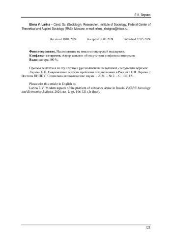 Уровень детско-подростковой заболеваемости, связанной с употреблением психоактивных веществ (ПАВ), всплеск летальных исходов, вызванных токсическими отравлениями, а также рост отдельных показателей, связанных с употреблением ненаркотических ПАВ, в Российской Федерации актуализируют анализ современного состояния проблемы токсикомании в стране. В статье представлены данные вторичного анализа материалов опросов трудоспособного городского населения РФ (2019 г., N = 1350; 2021 г., N = 1355) и студентов российских высших учебных заведений (2021 г., N = 528), проведенных сектором социологии девиантного поведения Института социологии ФНИСЦ РАН при непосредственном участии автора. Осуществлен обзор специализированных статистических данных и содержания сегмента сети интернет, посвященного изучаемой проблематике. Рассмотрены два наиболее распространенных на сегодняшний день вида токсикомании: газовая (т. н. «сниффинг») и употребление лекарственных препаратов в немедицинских целях. Произведен обзор осуществляемых мер по противодействию токсикомании. Выявлено, что наиболее остро рассматриваемая проблема стоит среди подросткового населения, что обусловлено такими факторами, как латентный характер приема токсических веществ ввиду практически полного отсутствия внешних признаков употребления; широкая доступность приобретения товаров, распространенных в использовании для достижения токсического опьянения, их относительно невысокая стоимость, а также легальный оборот.
