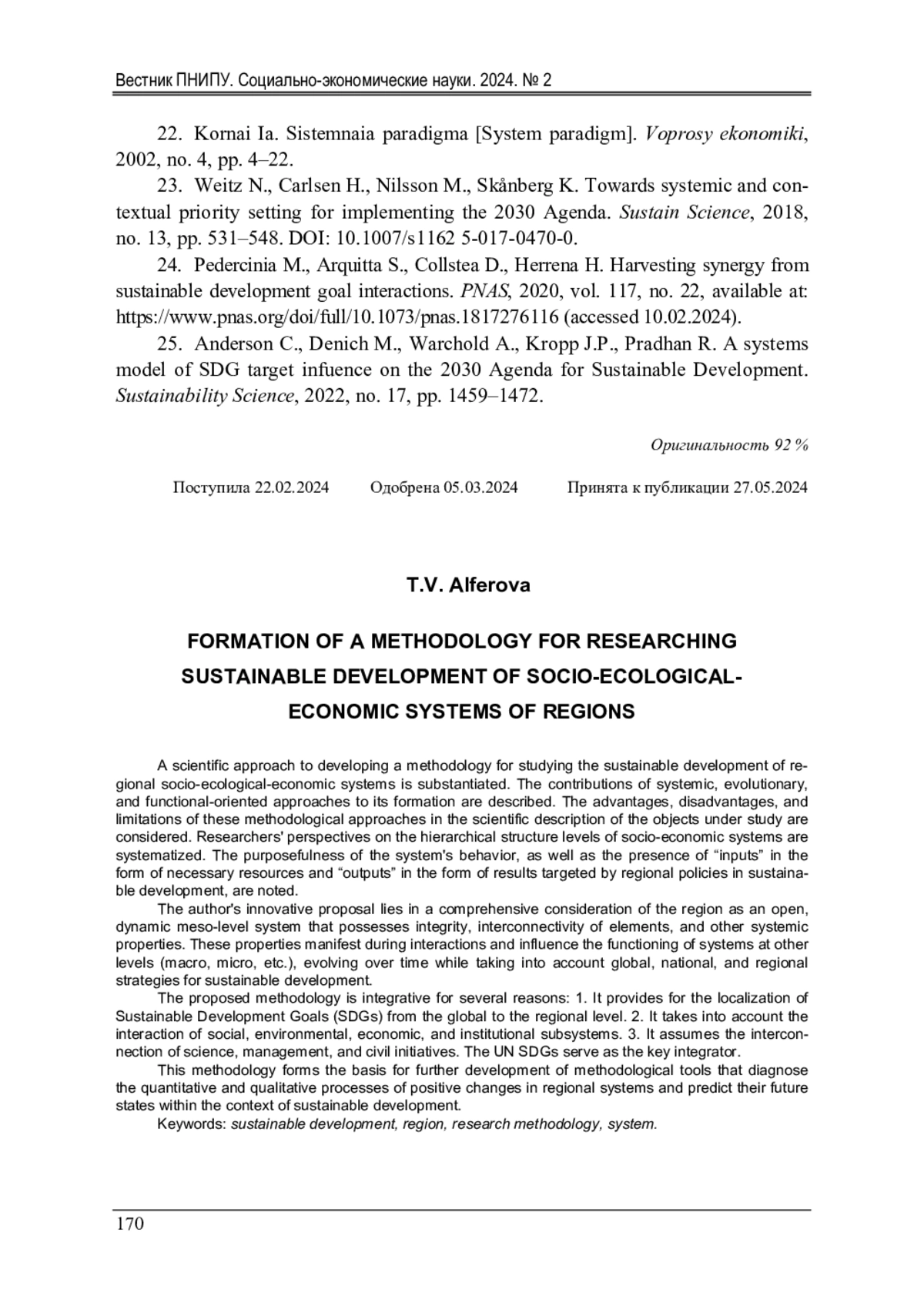 Обоснован научный подход к разработке методологии исследования устойчивого развития региональных социо-эколого-экономических систем. Описан вклад в ее формирование системного, эволюционного и функционально-ориентированного подходов. Рассмотрены достоинства, недостатки и ограничения данных методологических подходов к научному описанию исследуемых объектов. Систематизированы взгляды исследователей на уровни иерархической структуры социально-экономических систем. Отмечена целенаправленность поведения системы и наличие «входов» в виде необходимых ресурсов и «выходов» в виде результатов, на которые направлена региональная политика в области устойчивого развития. Предложение автора, имеющее научную новизну, заключается в комплексном рассмотрении региона как открытой, динамической системы мезоуровня, обладающей целостностью, взаимосвязанностью элементов и другими системными свойствами, проявляющимися при их взаимодействии и оказывающих влияние на функционирование систем других уровней (макро-, микро- и т. д.), эволюционно изменяющихся во времени, учитывающих глобальную, национальную и региональные стратегии устойчивого развития. Предложенная методология является интегративной по ряду оснований: 1) предусматривает локализацию ЦУР с глобального до регионального уровня; 2) учитывает взаимодействие социальной, экологической, экономической и институциональной подсистем; 3) предполагает взаимосвязь науки, управления и гражданских инициатив. При этом ключевым интегратором являются цели устойчивого развития ООН. Данная методология является логической основой для дальнейшей разработки методического инструментария, диагностирующего количественные и качественные процессы позитивных изменений региональных систем и позволяющего прогнозировать их дальнейшее состояние в контексте устойчивого развития. В этом заключается ее практическая значимость и применимость в прикладных целях.
