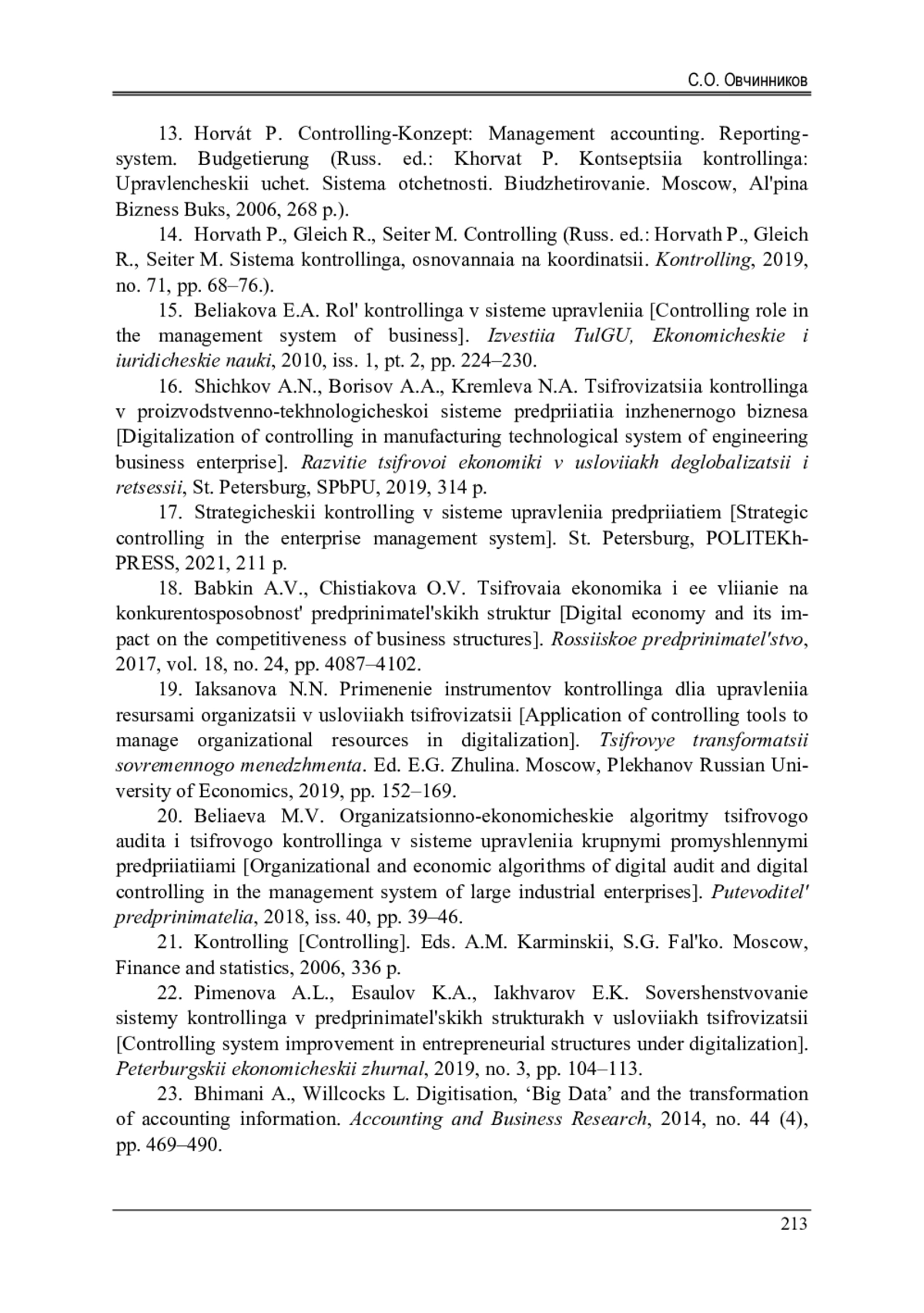 22. 	Пименова, А.Л. Совершенствование системы контроллинга в предпринимательских структурах в условиях цифровизации / А.Л. Пименова, К.А. Эсаулов, Е.К. Яхваров // Петербургский экономический журнал. - 2019. - № 3. - С. 104-113.  EDN: IXXGGD