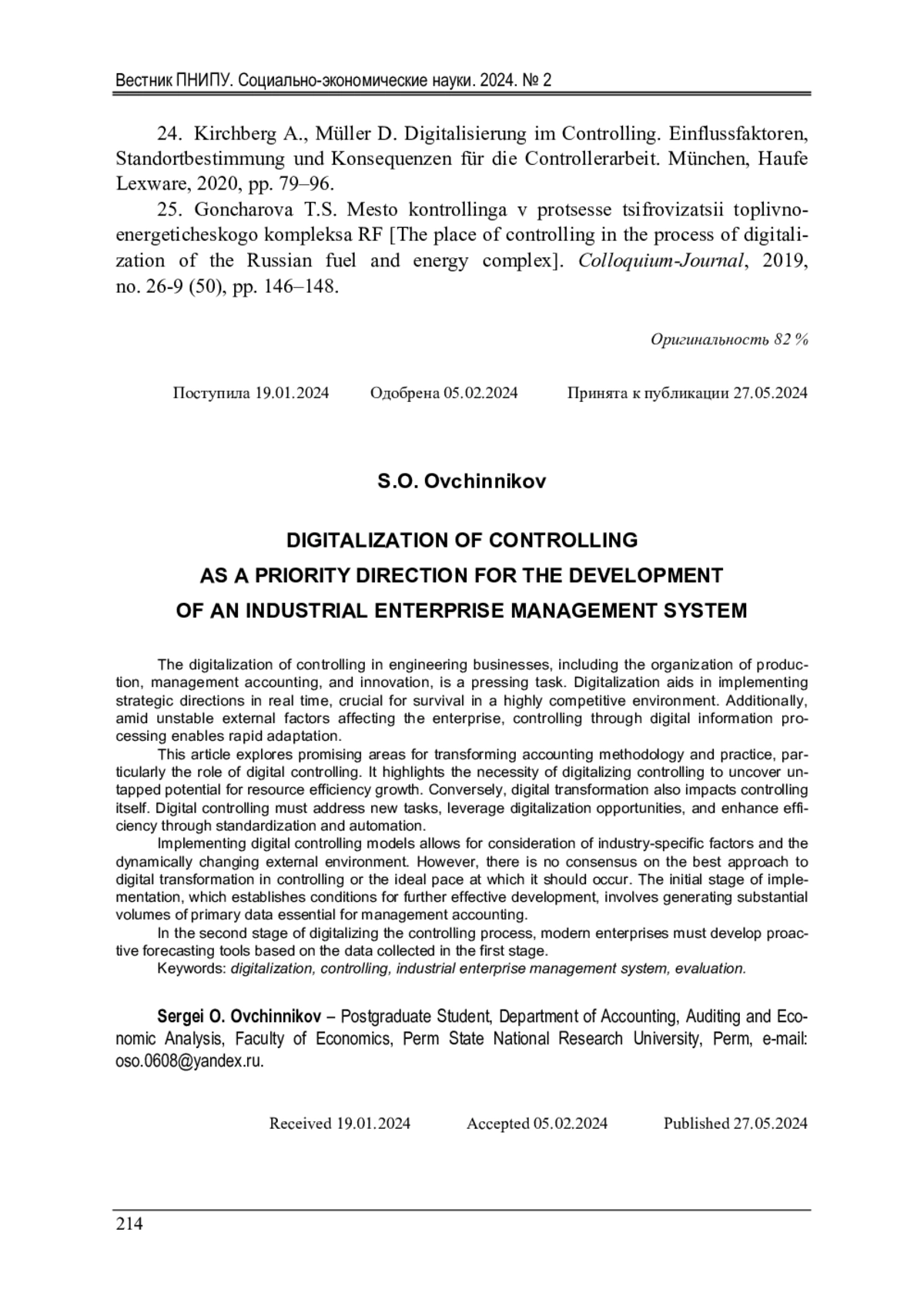 24. 	Kirchberg, A. Digitalisierung im Controlling. Einflussfaktoren, Standortbestimmung und Konsequenzen für die Controllerarbeit / A. Kirchberg, D. Müller. - München: Haufe Lexware. - 2020. - Р. 79-96.