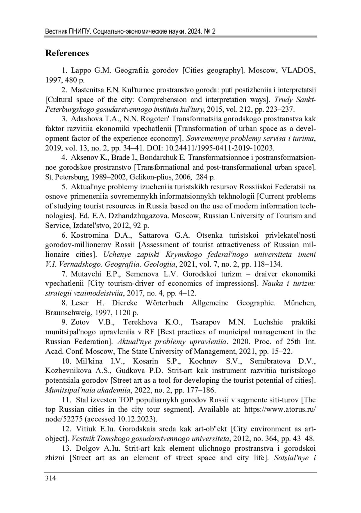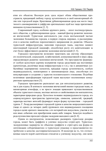 3. 	Адашова, Т.А. Трансформация городского пространства как фактор развития экономики впечатлений / Т.А. Адашова, Н.Н. Роготень // Современные проблемы сервиса и турима. - 2019. - Т. 13, № 2. - С. 34-41.  DOI: 10.24411/1995-0411-2019-10203