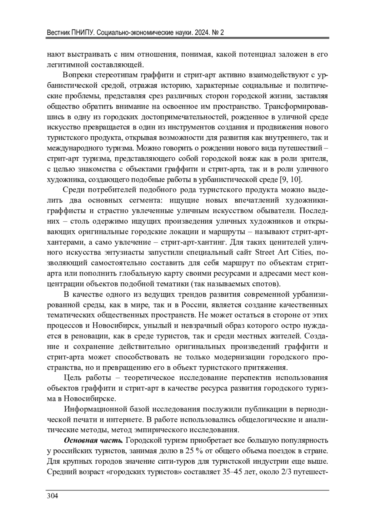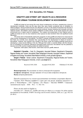 Граффити и стрит-арт - самые живые из современных видов искусства, повсеместно переживающие бум своего развития. В прошлое уходит время, когда их считали лишь проявлением вандализма со стороны уличных хулиганов. Трансформировавшись в одну из городских достопримечательностей, рожденное в уличной среде искусство превращается в один из инструментов создания и продвижения нового туристского продукта, открывая возможности для развития как внутреннего, так и международного туризма. Не может остаться в стороне от этих процессов и Новосибирск, туристский образ которого, как и городская среда, остро нуждается в «реновации». Создание и сохранение действительно оригинальных произведений граффити и стрит-арта может способствовать не только модернизации городского пространства, но и превращению его в объект туристского притяжения. Цель работы - теоретическое исследование перспектив использования объектов граффити и стрит-арт в качестве ресурса развития городского туризма в Новосибирске. Проведенный в ходе исследования SWOT-анализ позволяет сделать вывод: препятствий для развития стрит-арт туризма в Новосибирске пока больше, чем возможностей. Однако подобное положение может измениться в будущем, поскольку потенциал ресурсов для формирования туристского предложения в городе имеется. Сегодня их масштаб ограничен, но с появлением интересного и аутентичного предложения, использующего эти ресурсы, город имеет возможности вырасти в один из центров стрит-арт туризма страны.