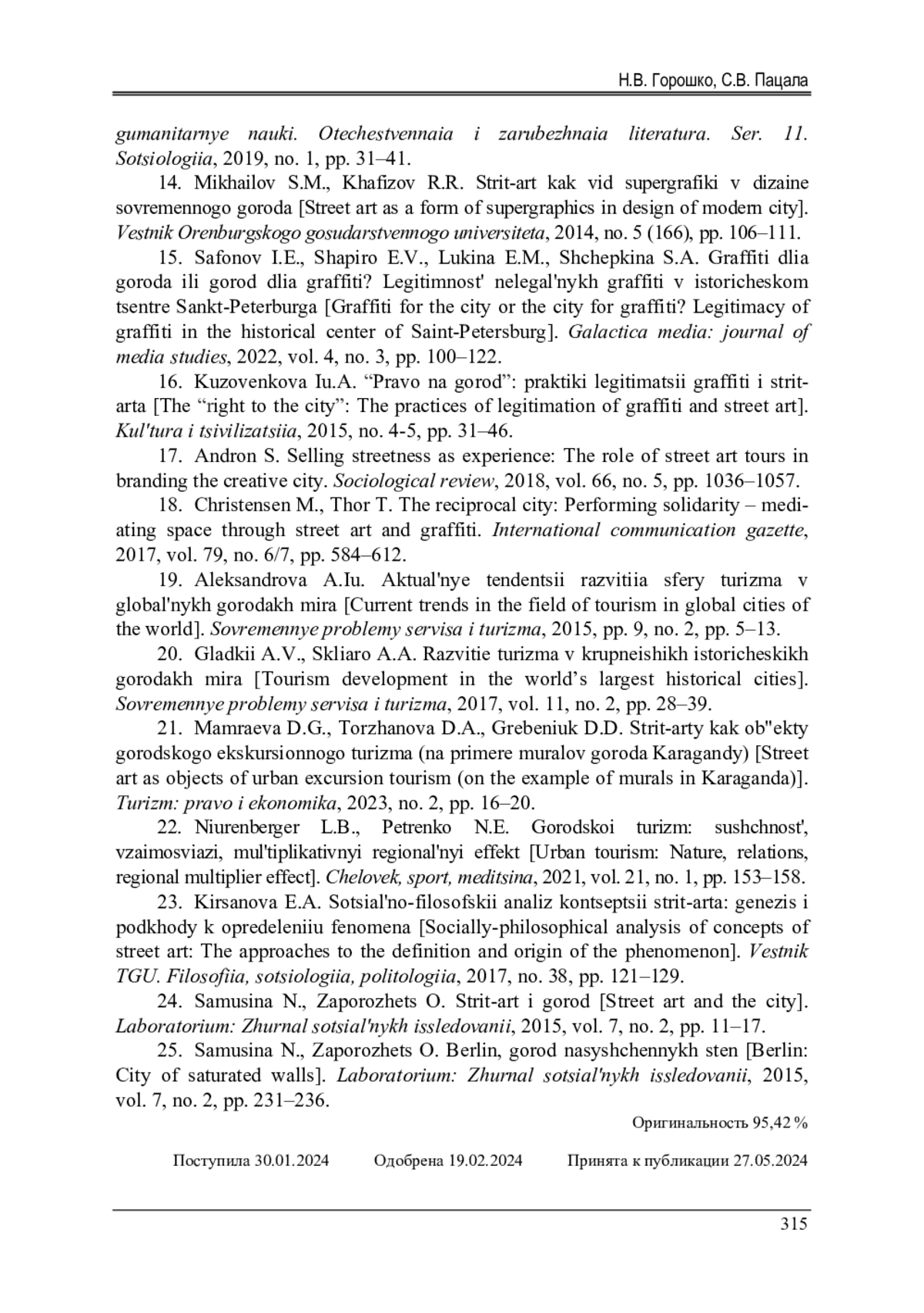 24. 	Самусина, Н. Стрит-арт и город / Н. Самусина, О. Запорожец // Laboratorium: Журнал социальных исследований. - 2015. - Т. 7, № 2. - С. 11-17.  EDN: WMEXUN