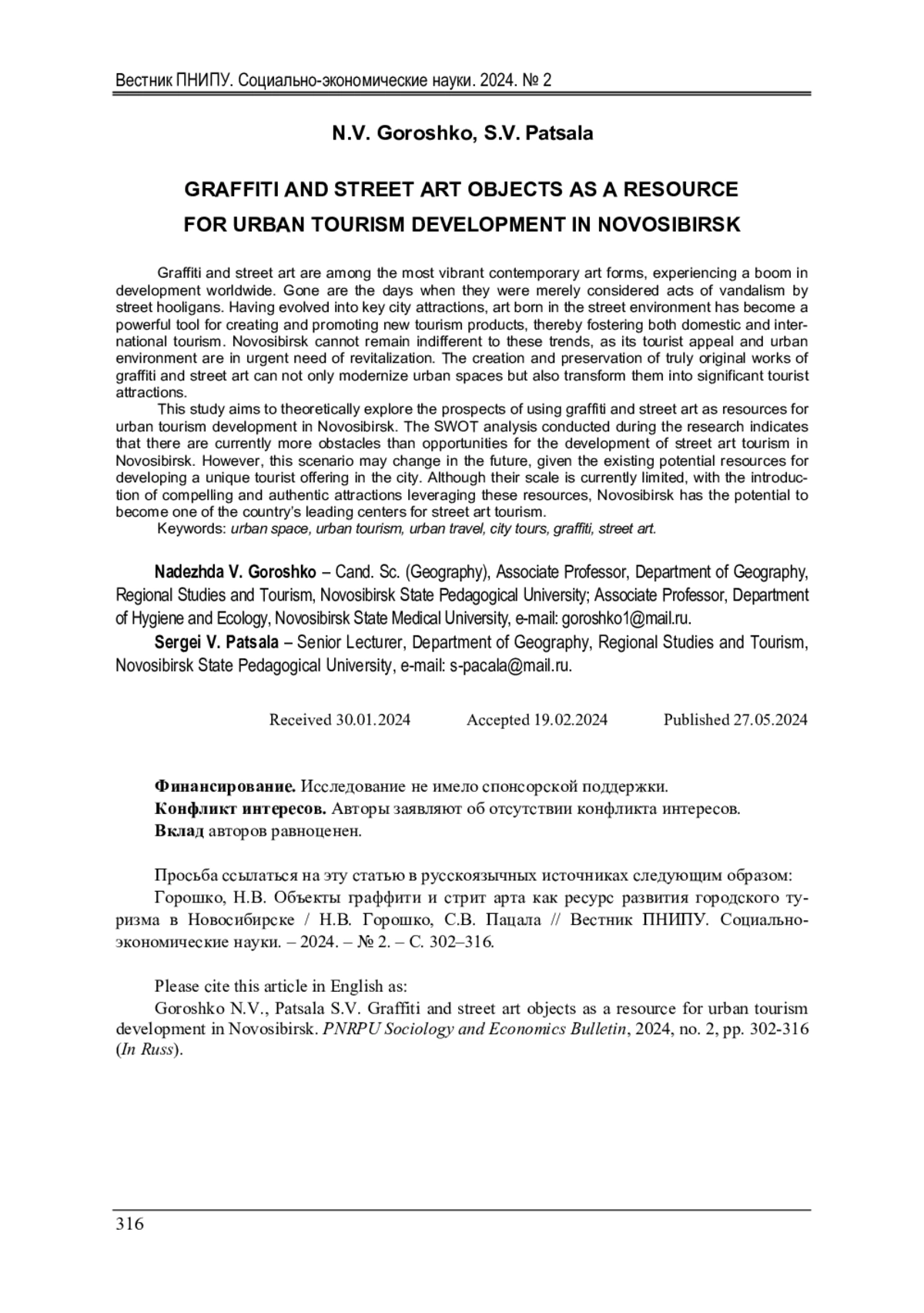10. 	Стрит-арт как инструмент развития туристского потенциала городов / И.В. Милькина, С.П. Косарин, С.В. Кочнев, Д.В. Семибратова, А.С. Кожевникова, П.Д. Гудкова // Муниципальная академия. - 2022. - № 2. - С. 177-186.  EDN: QZOFOU