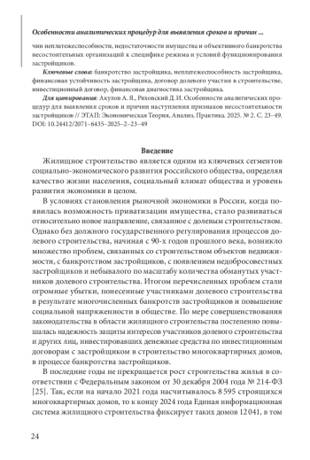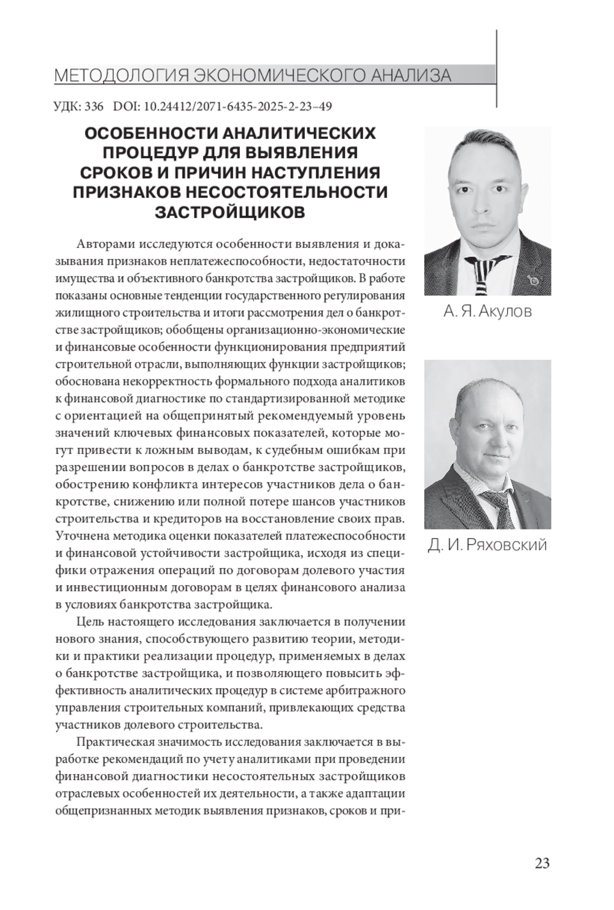 Авторами исследуются особенности выявления и доказывания признаков неплатежеспособности, недостаточности имущества и объективного банкротства застройщиков. В работе показаны основные тенденции государственного регулирования жилищного строительства и итоги рассмотрения дел о банкротстве застройщиков; обобщены организационно-экономические и финансовые особенности функционирования предприятий строительной отрасли, выполняющих функции застройщиков; обоснована некорректность формального подхода аналитиков к финансовой диагностике по стандартизированной методике с ориентацией на общепринятый рекомендуемый уровень значений ключевых финансовых показателей, которые могут привести к ложным выводам, к судебным ошибкам при разрешении вопросов в делах о банкротстве застройщиков, обострению конфликта интересов участников дела о банкротстве, снижению или полной потере шансов участников строительства и кредиторов на восстановление своих прав. Уточнена методика оценки показателей платежеспособности и финансовой устойчивости застройщика, исходя из специфики отражения операций по договорам долевого участия и инвестиционным договорам в целях финансового анализа в условиях банкротства застройщика.