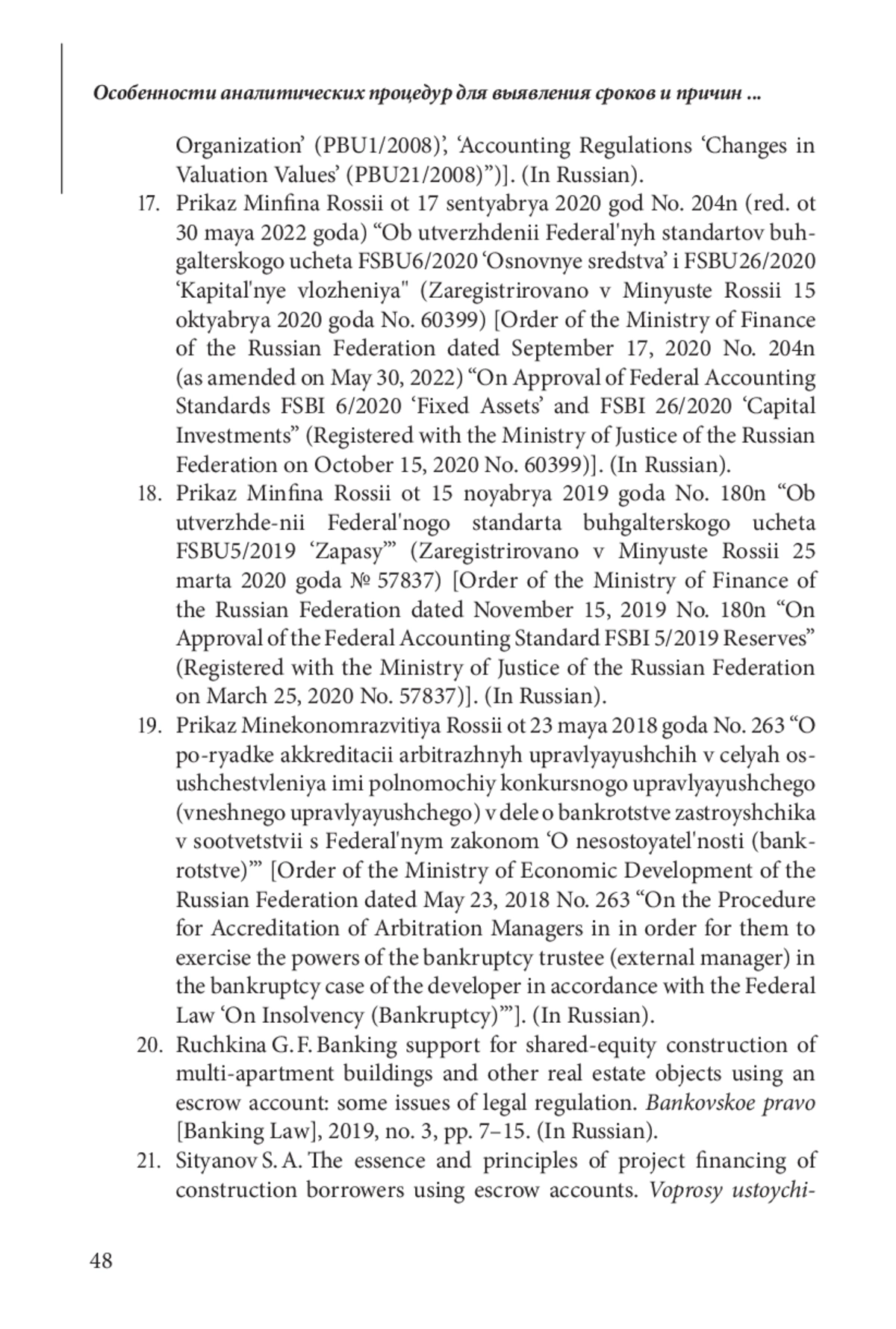 21. Ситянов С. А. Сущность и принципы проектного финансирования заемщиков-застройщиков с использованием счетов-эскроу // Вопросы устойчивого развития общества. 2021. № 3. С.10-15.