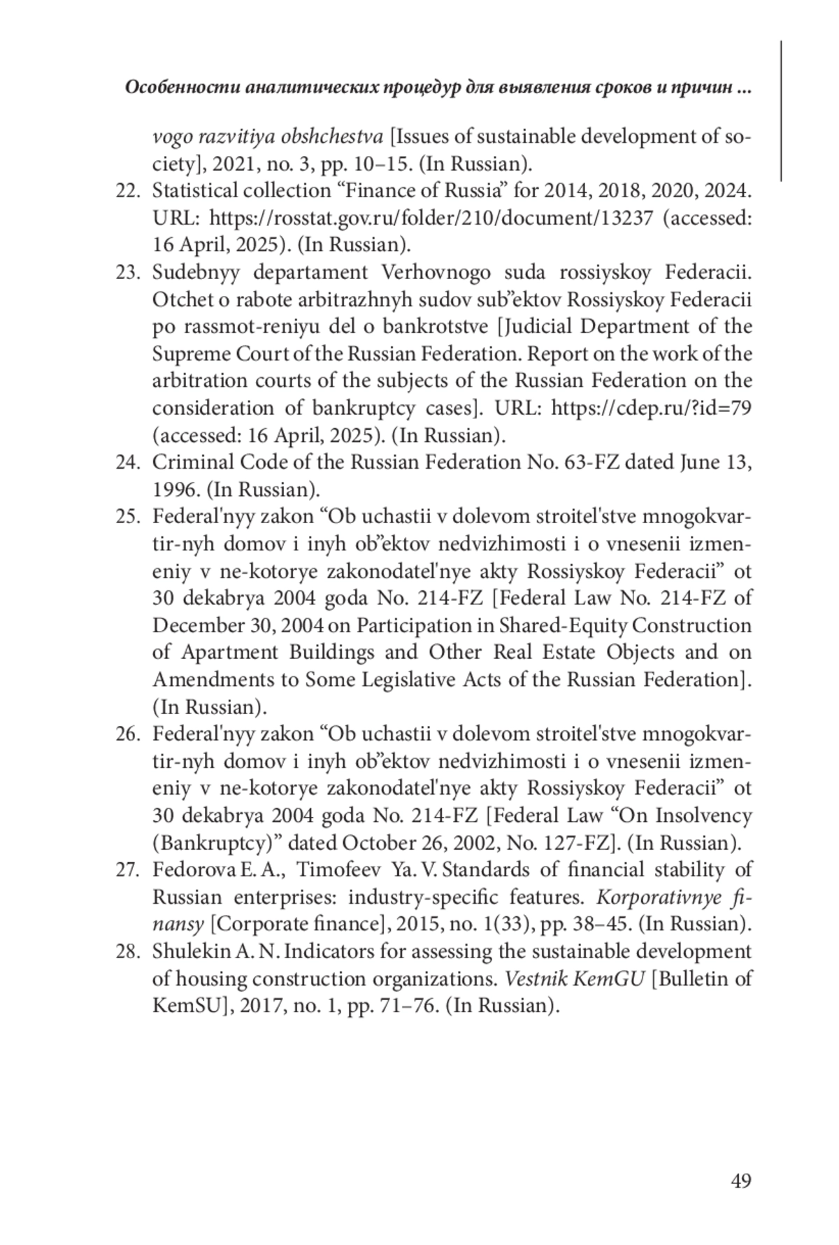 4. Димитриев А. М., Решетько К. М. Современные тенденции и причины несостоятельности застройщиков // Вестник Алтайской академии экономики и права. 2020. № 5-2. С. 285-294.