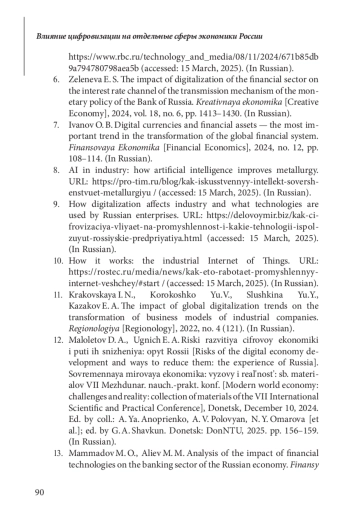 6. 	Зеленева Е. С. Влияние цифровизации финансовой сферы на процентный канал трансмиссионного механизма денежно-кредитной политики Банка России // Креативная экономика. 2024. Том 18, № 6. С. 1413-1430.
