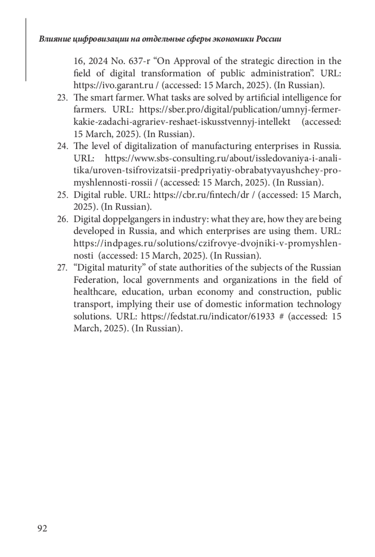 23. 	Умный фермер. Какие задачи аграриев решает искусственный интеллект. URL: https://sber.pro/digital/publication/umnyj-fermer-kakie-zadachi-agrariev-reshaet-iskusstvennyj-intellekt/ (дата обращения: 15 марта 2025 года).