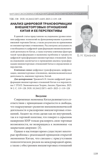 В данной статье представлено исследование уровня влияния цифровых технологий на функционирование и развитие внешней торговли Китая, а также результаты их применения во внешнеторговых отношениях. Рассмотрена актуальность и необходимость цифровой трансформации внешнеэкономической деятельности Китая, а также изучены ключевые факторы такой трансформации и выявлены проблемы и трудности цифровой трансформации внешнеторговых отношений. Цель исследования заключается в проведении анализа трансформации внешнеторговых отношений Китая и определении ее перспектив.