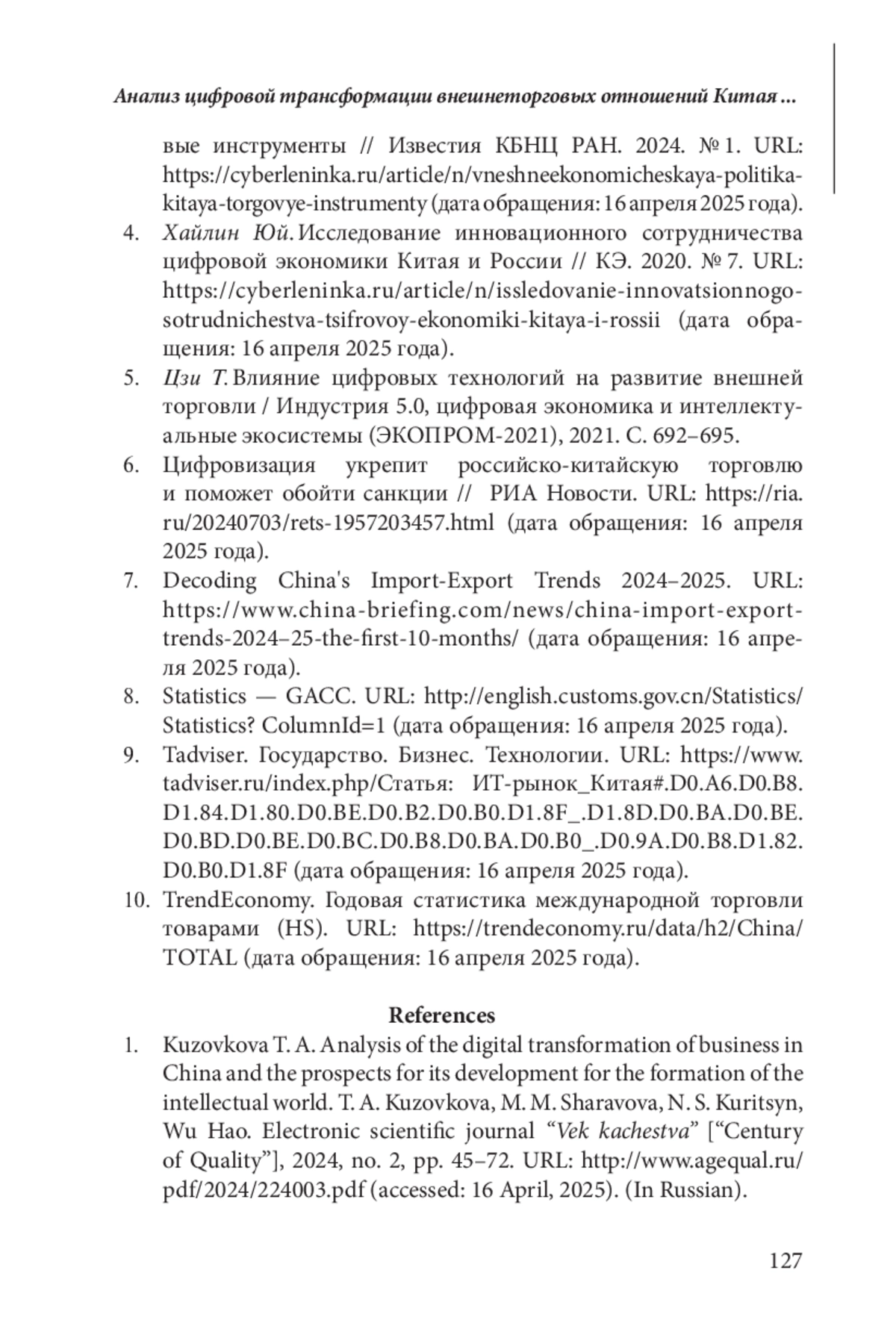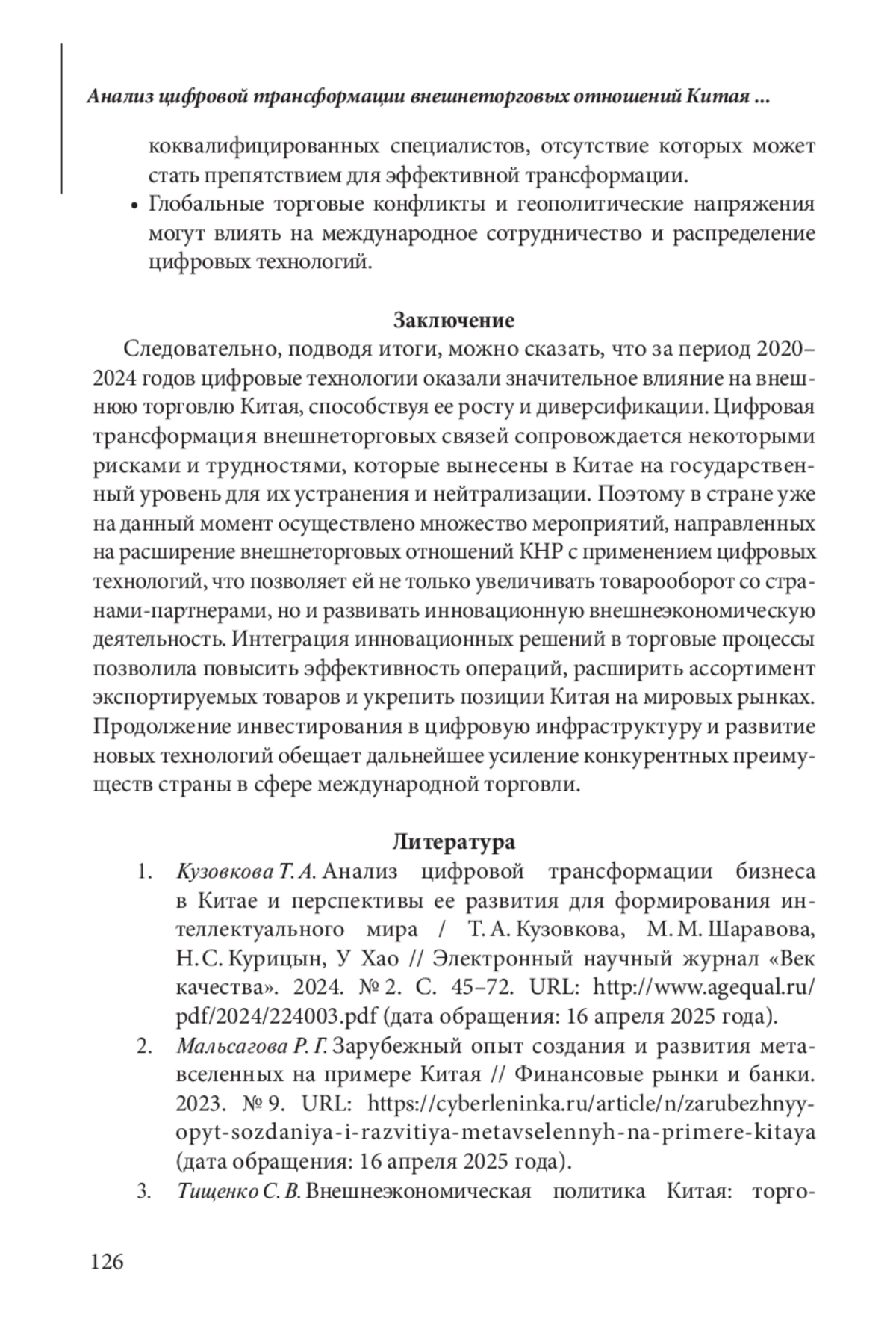 1. 	Кузовкова Т. А. Анализ цифровой трансформации бизнеса в Китае и перспективы ее развития для формирования интеллектуального мира / Т. А. Кузовкова, М. М. Шаравова, Н. С. Курицын, У Хао // Электронный научный журнал “Век качества”. 2024. № 2. С. 45-72. URL: http://www.agequal.ru/pdf/2024/224003.pdf (дата обращения: 16 апреля 2025 года).