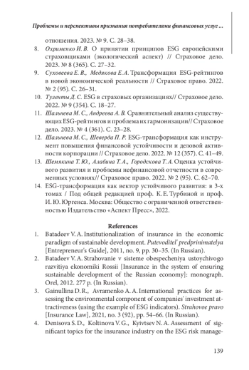 8. Охрименко И. В. О принятии принципов ESG европейскими страховщиками (экологический аспект) // Страховое дело. 2023. № 8 (365). С. 27-32.
