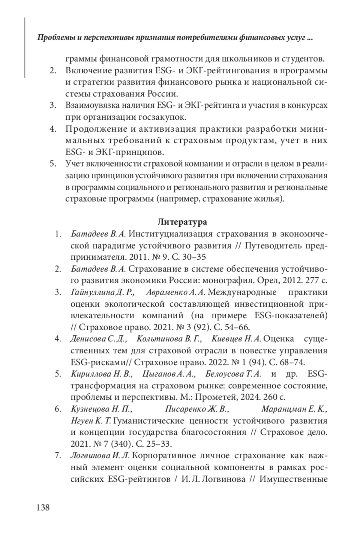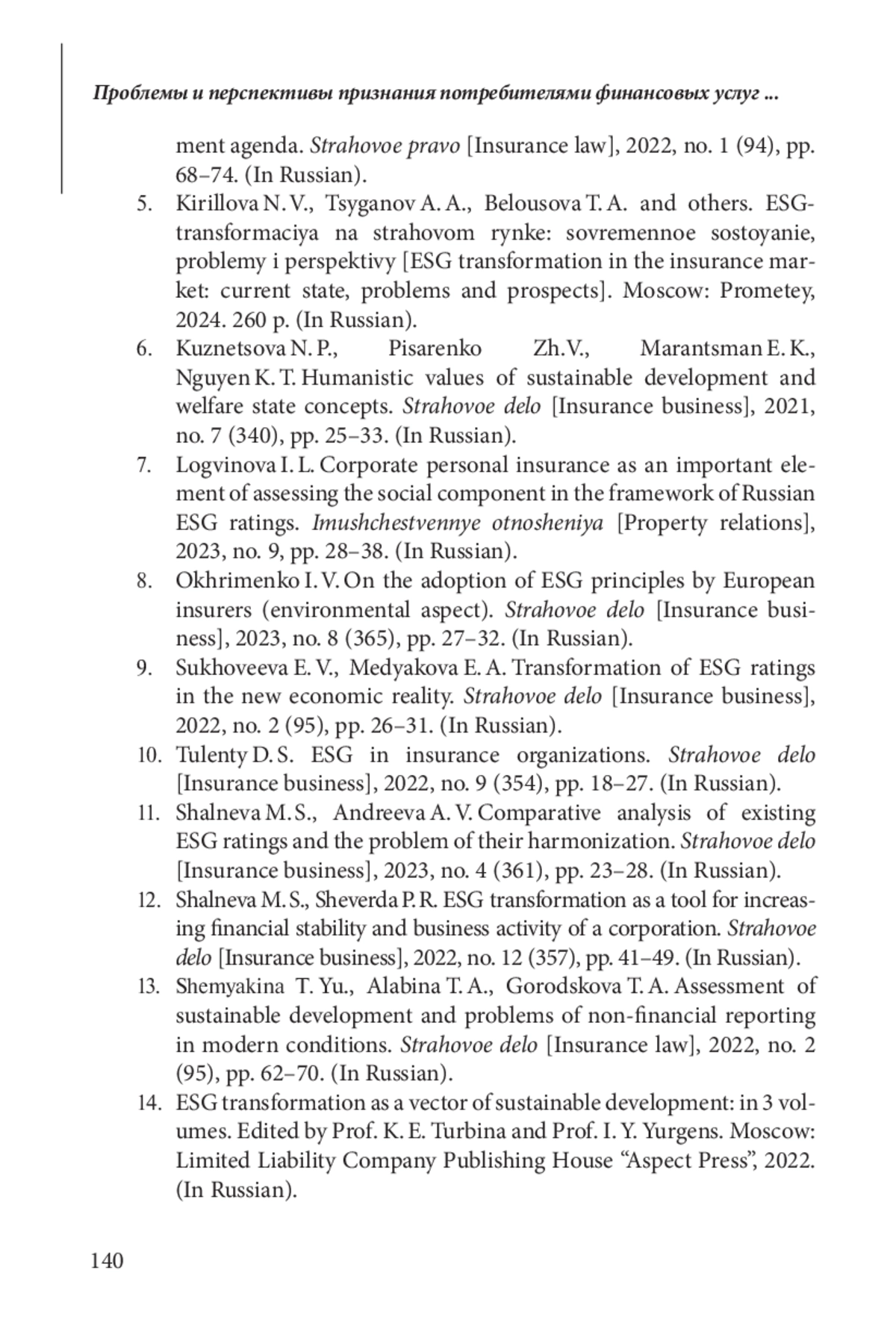 5. Кириллова Н. В., Цыганов А. А., Белоусова Т.А. и др. ESG-трансформация на страховом рынке: современное состояние, проблемы и перспективы. М.: Прометей, 2024. 260 с.