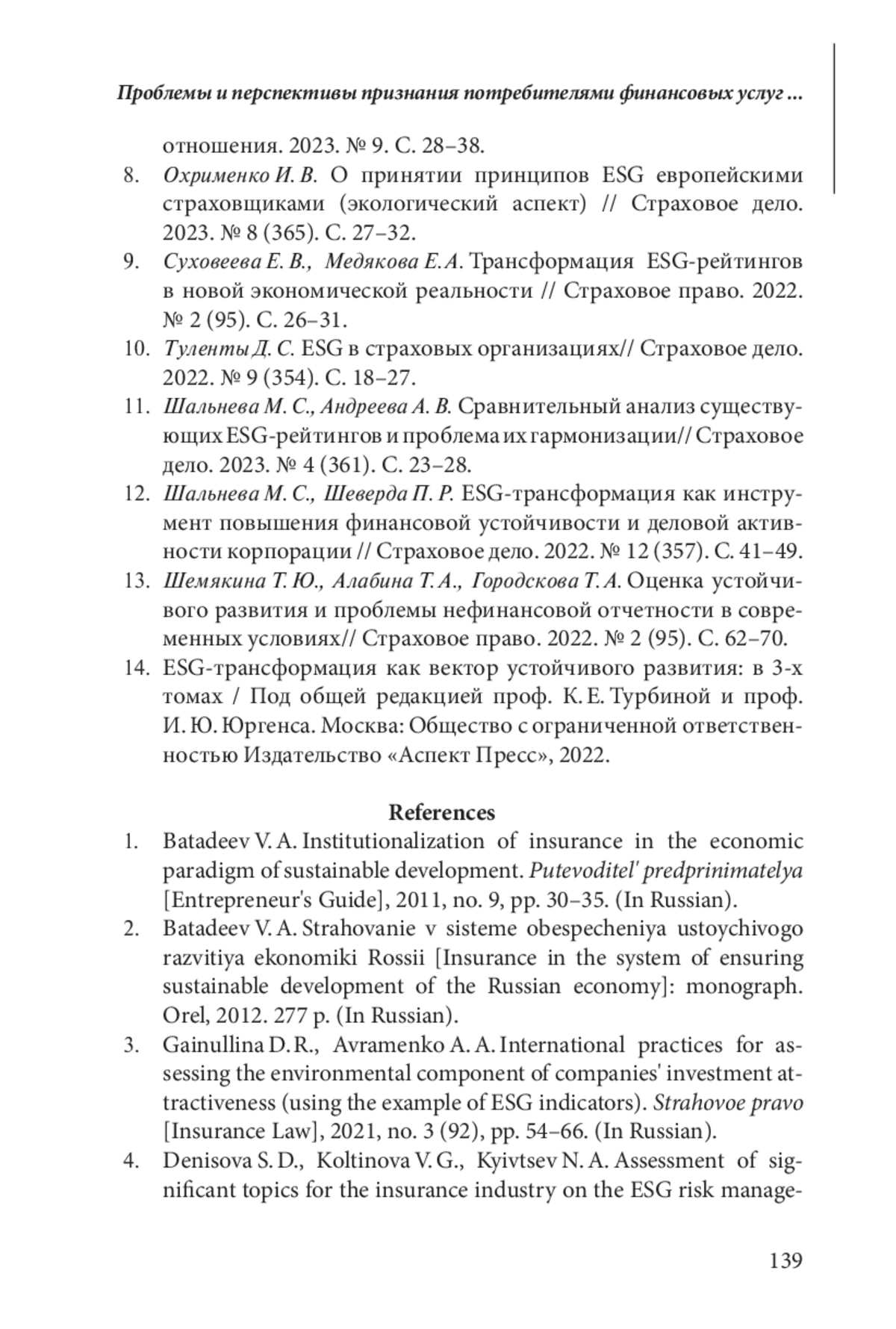 11. Шальнева М. С, Андреева А. В. Сравнительный анализ существующих ESG-рейтингов и проблема их гармонизации// Страховое дело. 2023. № 4 (361). С. 23-28.