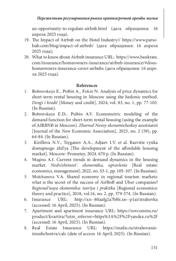 1. Бобровская Е, Полбин А., Фокин Н. Анализ динамики цен на краткосрочную аренду жилья в Москве с применением гедонического метода// Деньги и кредит. 2024. Т. 83. № 1. С. 77-103.
