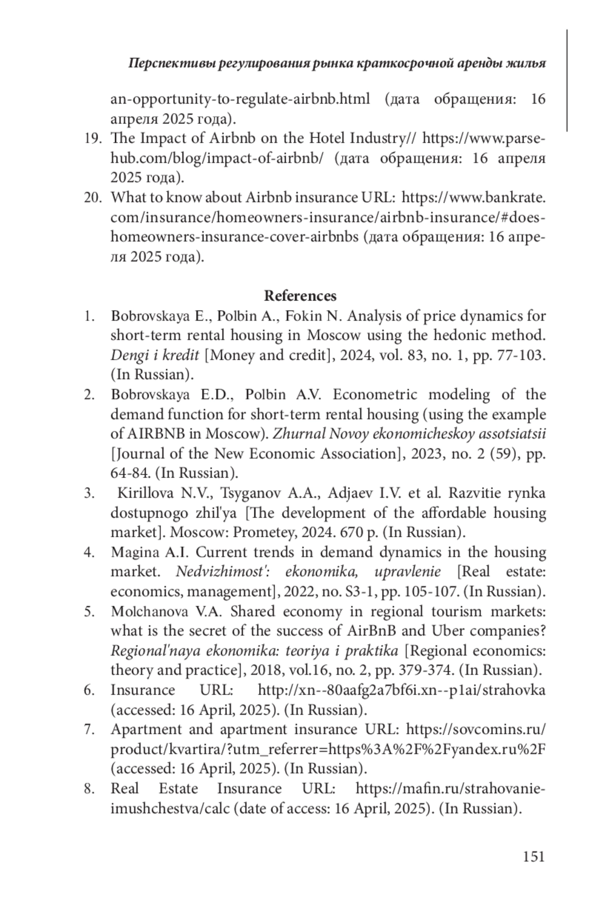 2. Бобровская Е.Д., Полбин А.В. Эконометрическое моделирование функции спроса на краткосрочную аренду жилья (на примере AIRBNB в Москве)// Журнал Новой экономической ассоциации. 2023. № 2 (59). С. 64-84.