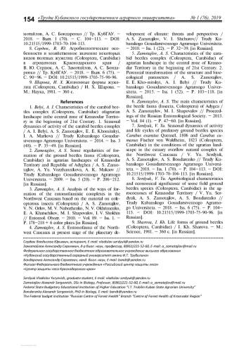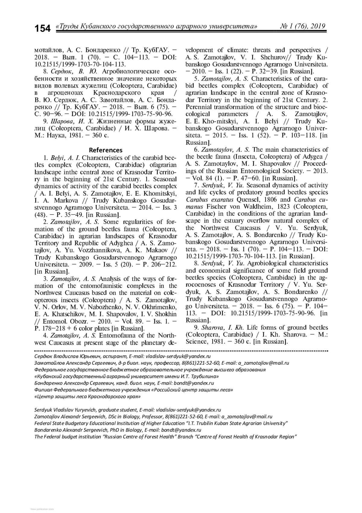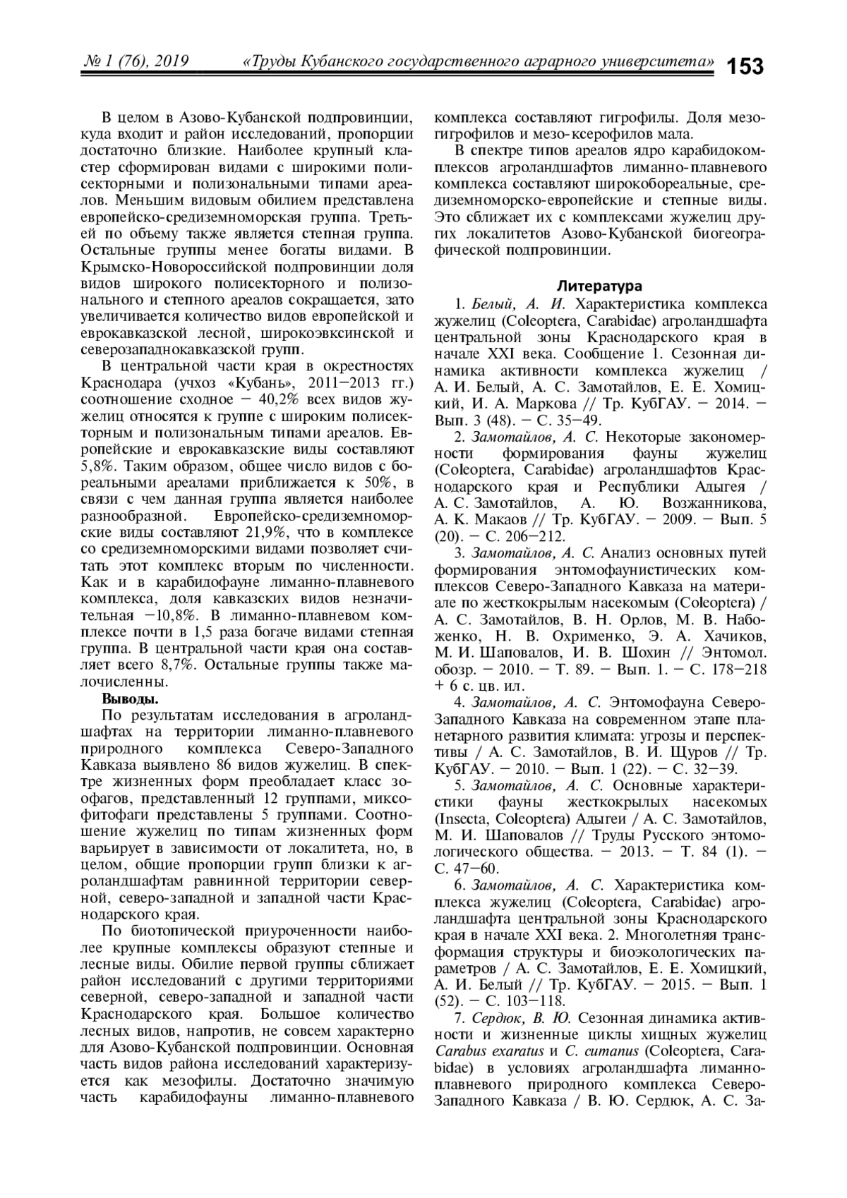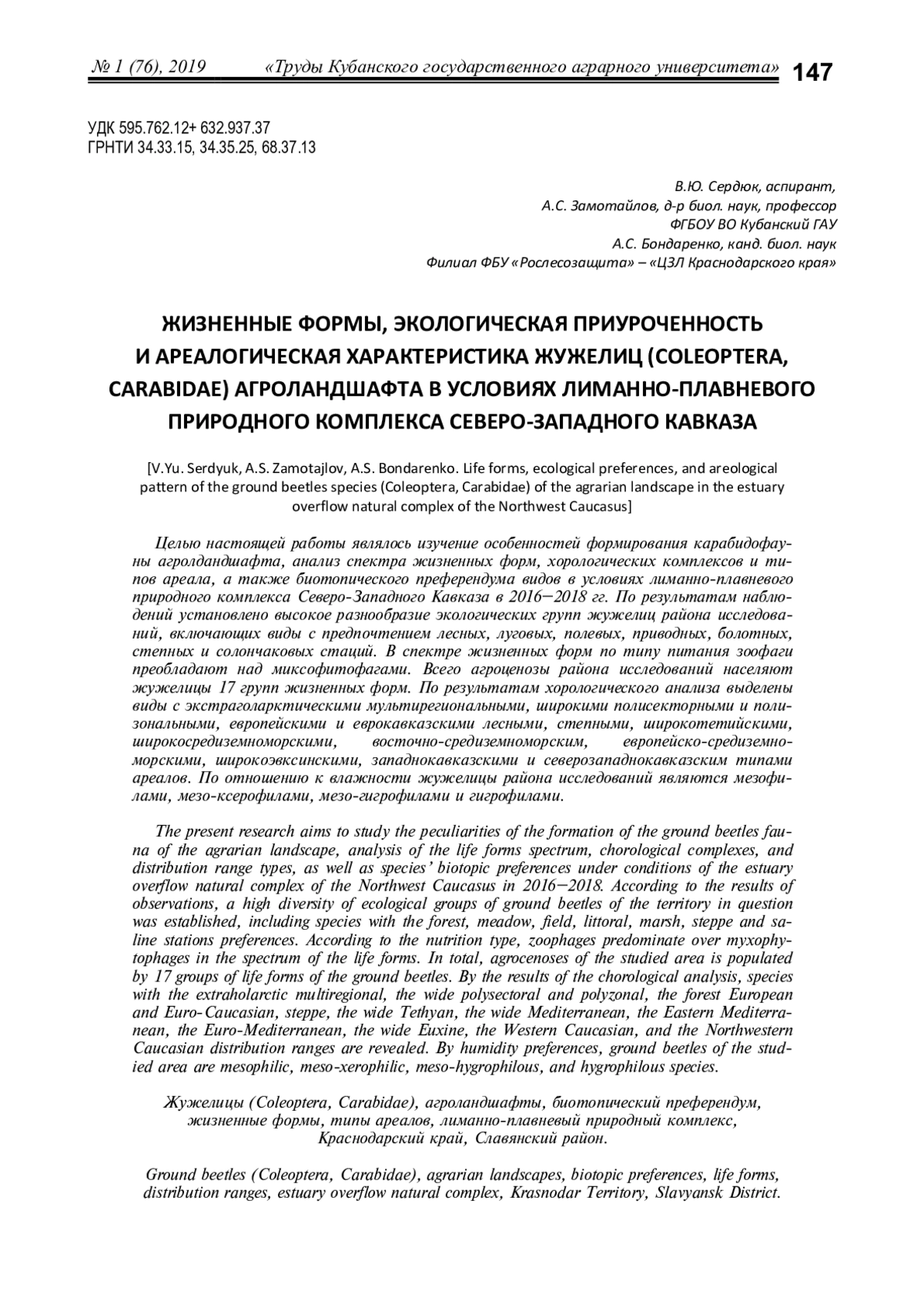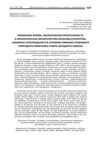 Целью настоящей работы являлось изучение особенностей формирования карабидофауны агролдандшафта, анализ спектра жизненных форм, хорологических комплексов и типов ареала, а также биотопического преферендума видов в условиях лиманно-плавневого природного комплекса Северо-Западного Кавказа в 2016-2018 гг. По результатам наблюдений установлено высокое разнообразие экологических групп жужелиц района исследований, включающих виды с предпочтением лесных, луговых, полевых, приводных, болотных, степных и солончаковых стаций. В спектре жизненных форм по типу питания зоофаги преобладают над миксофитофагами. Всего агроценозы района исследований населяют жужелицы 17 групп жизненных форм. По результатам хорологического анализа выделены виды с экстраголарктическими мультирегиональными, широкими полисекторными и полизональными, европейскими и еврокавказскими лесными, степными, широкотетийскими, широкосредиземноморскими, восточно-средиземноморским, европейско-средиземноморскими, широкоэвксинскими, западнокавказскими и северозападнокавказским типами ареалов. По отношению к влажности жужелицы района исследований являются мезофилами, мезо-ксерофилами, мезо-гигрофилами и гигрофилами.