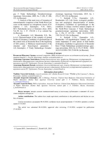 6. Замотайлов А.С., Хомицкий Е.Е., Белый А.И. Характеристика комплекса жужелиц (Coleoptera, Carabidae) агроландшафта центральной зоны Краснодарского края в начале XXI века. Сообщение 2. Многолетняя трансформация структуры и биоэкологических параметров // Труды Кубанского государственного аграрного университета. 2015. Вып. 1 (52). С. 103-118. EDN: TWPJXB