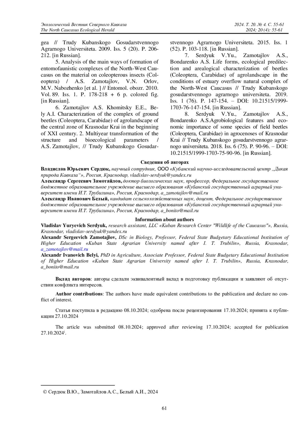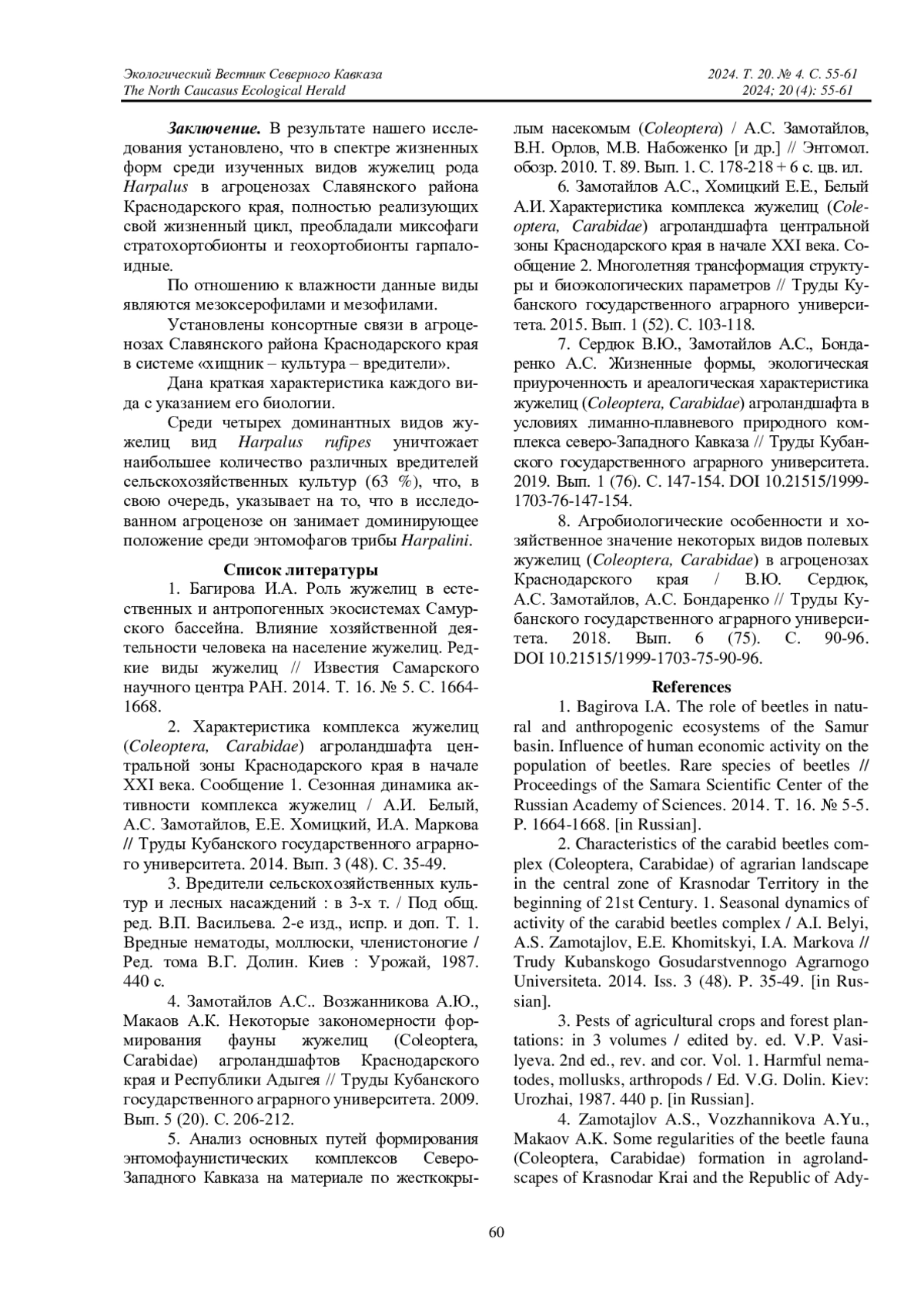 7. Сердюк В.Ю., Замотайлов А.С., Бондаренко А.С. Жизненные формы, экологическая приуроченность и ареалогическая характеристика жужелиц (Coleoptera, Carabidae) агроландшафта в условиях лиманно-плавневого природного комплекса северо-Западного Кавказа // Труды Кубанского государственного аграрного университета. 2019. Вып. 1 (76). С. 147-154. DOI: 10.21515/1999-1703-76-147-154 EDN: RSVVZG