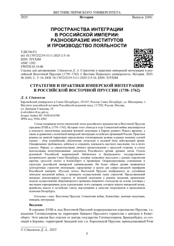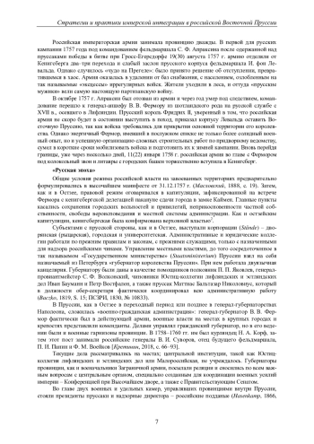 Статья посвящена почти пятилетней эпохе российского владычества в Восточной Пруссии середины XVIII в. (1758-1762). История этого эпизода в ходе Семилетней войны анализируется в контексте аналогичных режимов военной оккупации в Европе раннего Нового времени, а также в сравнении с политикой имперской интеграции остзейских провинций России. Практики режима на занятой территории определялись утилитарными целями в рамках военных усилий страны - сбор контрибуций, обеспечение логистики и тыловой базы действующей армии. Одновременно требовалось добиться и сохранить лояльность местного населения, что в итоге удалось. Наряду со свидетельствами личного происхождения с прусской стороны, в статье использованы неопубликованные документы Российского архива древних актов, Отдела рукописей Российской национальной библиотеки и Центрального государственного исторического архива Санкт-Петербурга, которые позволяют воссоздать с разных перспектив картину «русской эпохи» в Кенигсберге и провинции. Охарактеризованы становление и структура российской имперской администрации. На более общем уровне выявляются долгосрочные стратегии интеграции, характерные в целом для северо-западной периферии Российской империи. «Русская эпоха» Восточной Пруссии изображается не случайным эпизодом неудачной войны, а примером осуществления таких стратегий. Представленный материал демонстрирует переход от военной оккупации к режиму владения, применение модели осуществления общеимперского принципа непрямого господства на основе договора с местными корпорациями, роль в реализации этого сценария, которую играли имперский центр, армейские власти и остзейские элиты, выступавшие в качестве посредников и проводников политики Петербурга.