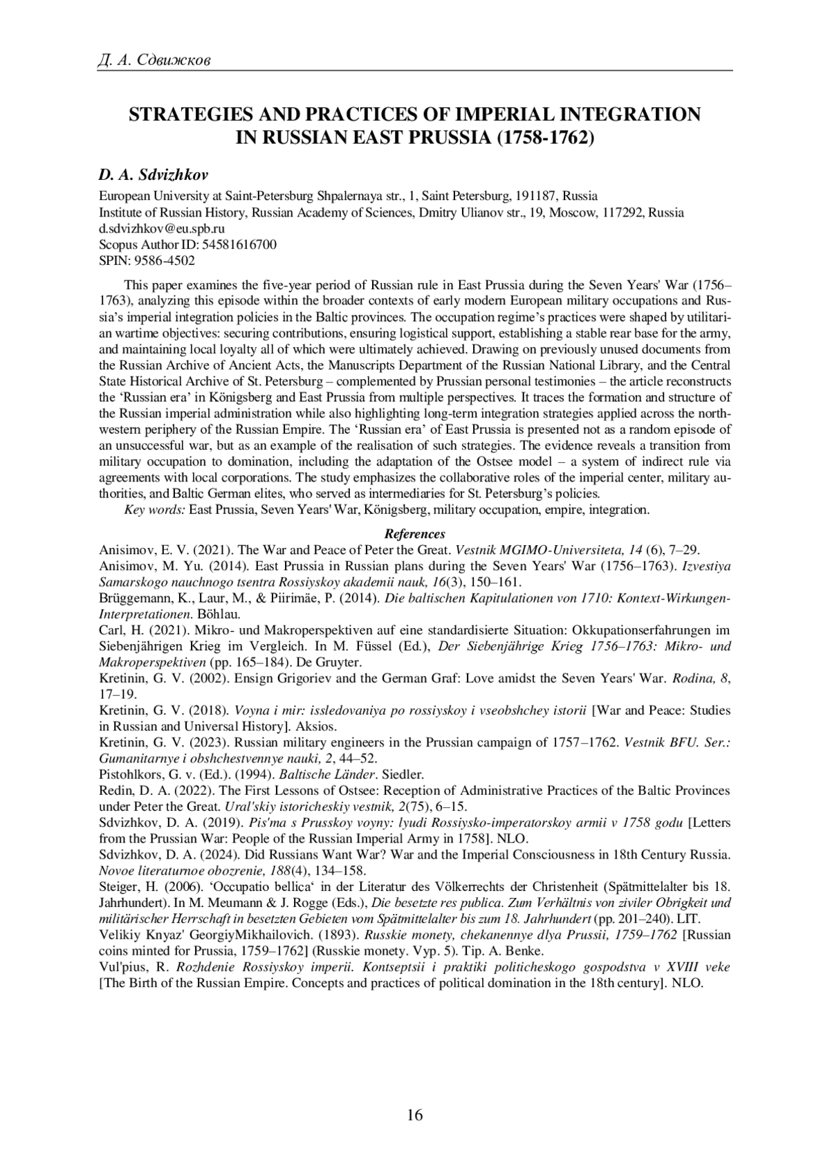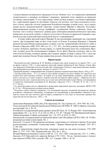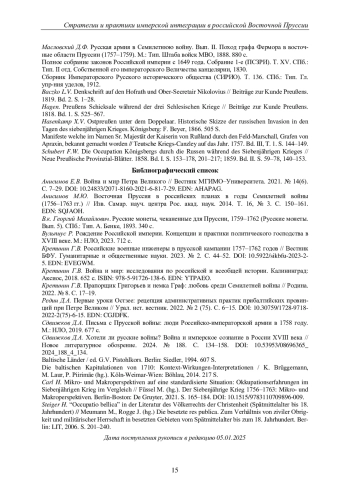 25. 	Сдвижков Д.А. Письма с Прусской войны: люди Российско-императорской армии в 1758 году. М.: НЛО, 2019. 677 с. EDN: YXBHAL